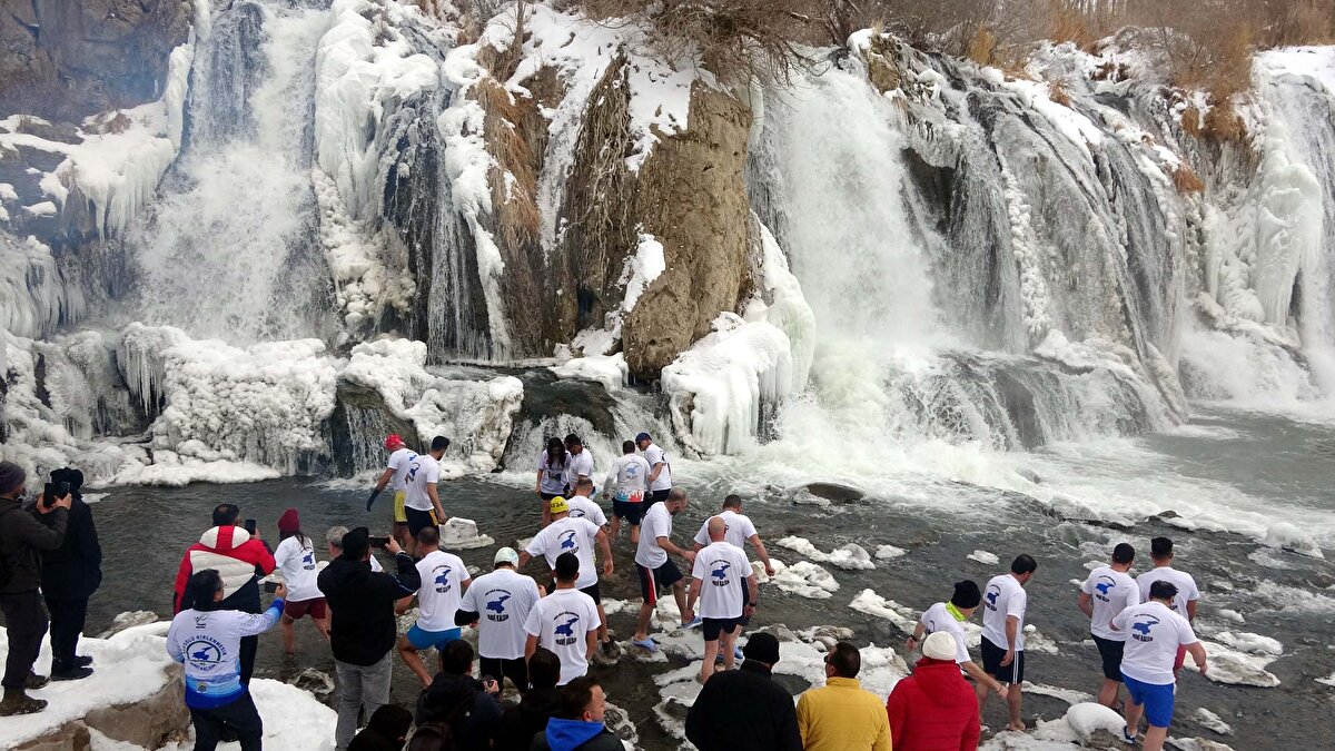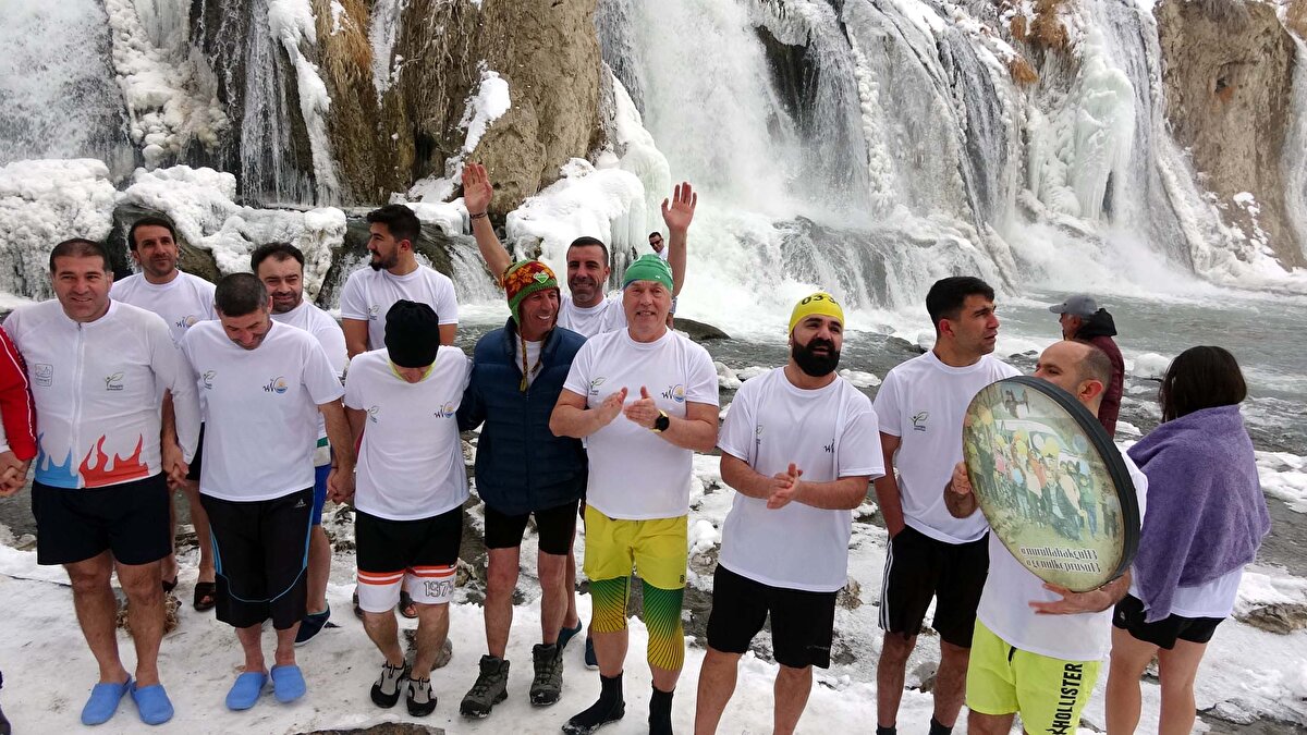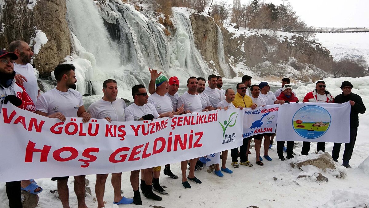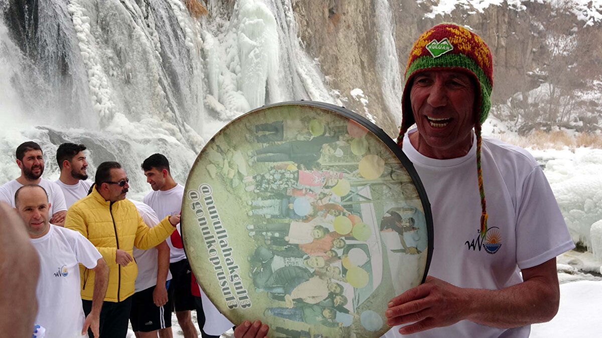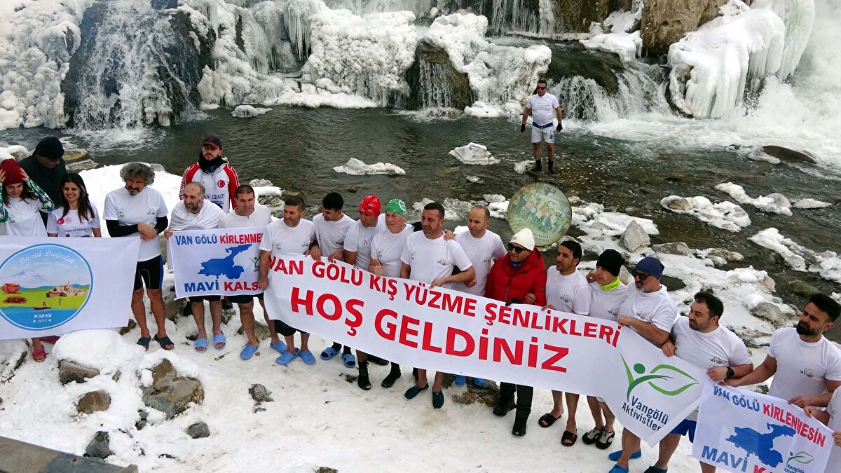 Van'ın kış turizmine dikkat çekmek isteyen 50 kişilik grup bu yıl 4'üncüsünü düzenledikleri 'Kış Yüzme Şenliği'nde, kısmen donan Muradiye Şelalesi'nin döküldüğü noktada buz gibi suda yüzüp, halay çekerek eğlendi.
