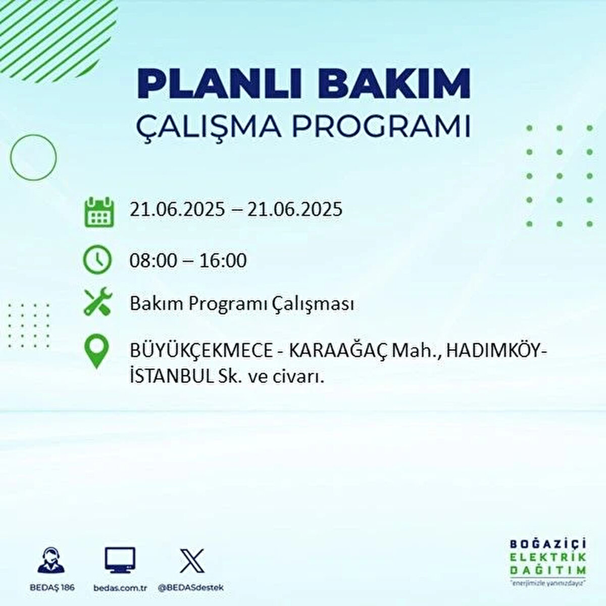 BEDAŞ ve AYEDAŞ, planlı bakım ve onarım çalışmaları kapsamında 21 Haziran Cumartesi ve 22 Haziran pazar günü İstanbul’un 15 ilçesinde elektrik kesintisi yapılacağını açıkladı. Kesinti programında, etkilenecek mahalle ve sokaklar ile elektrik verilmeyecek saat dilimleri detaylı olarak paylaşıldı.