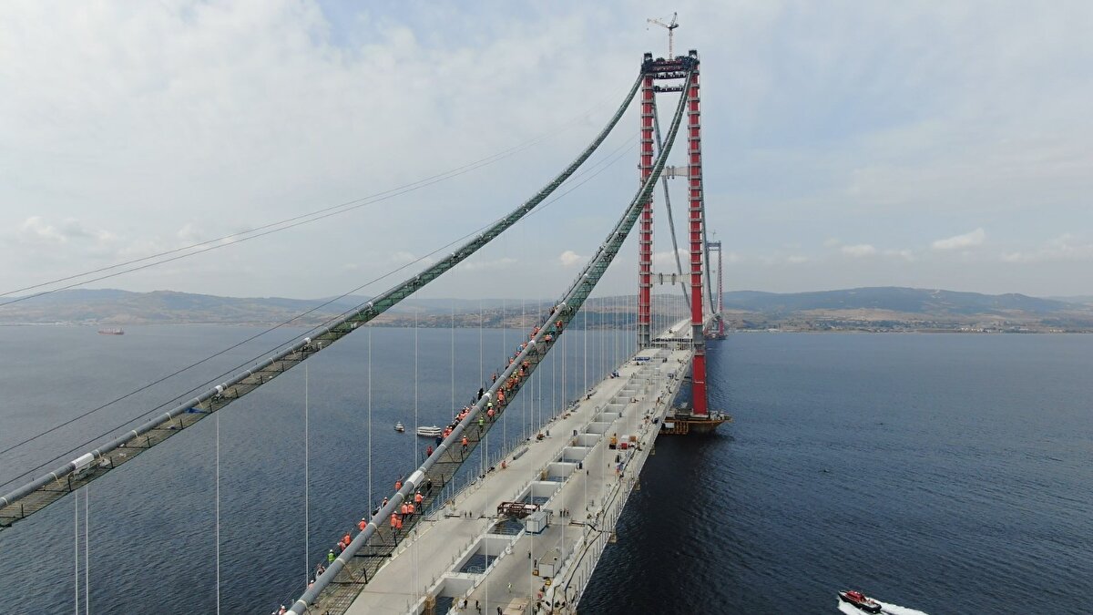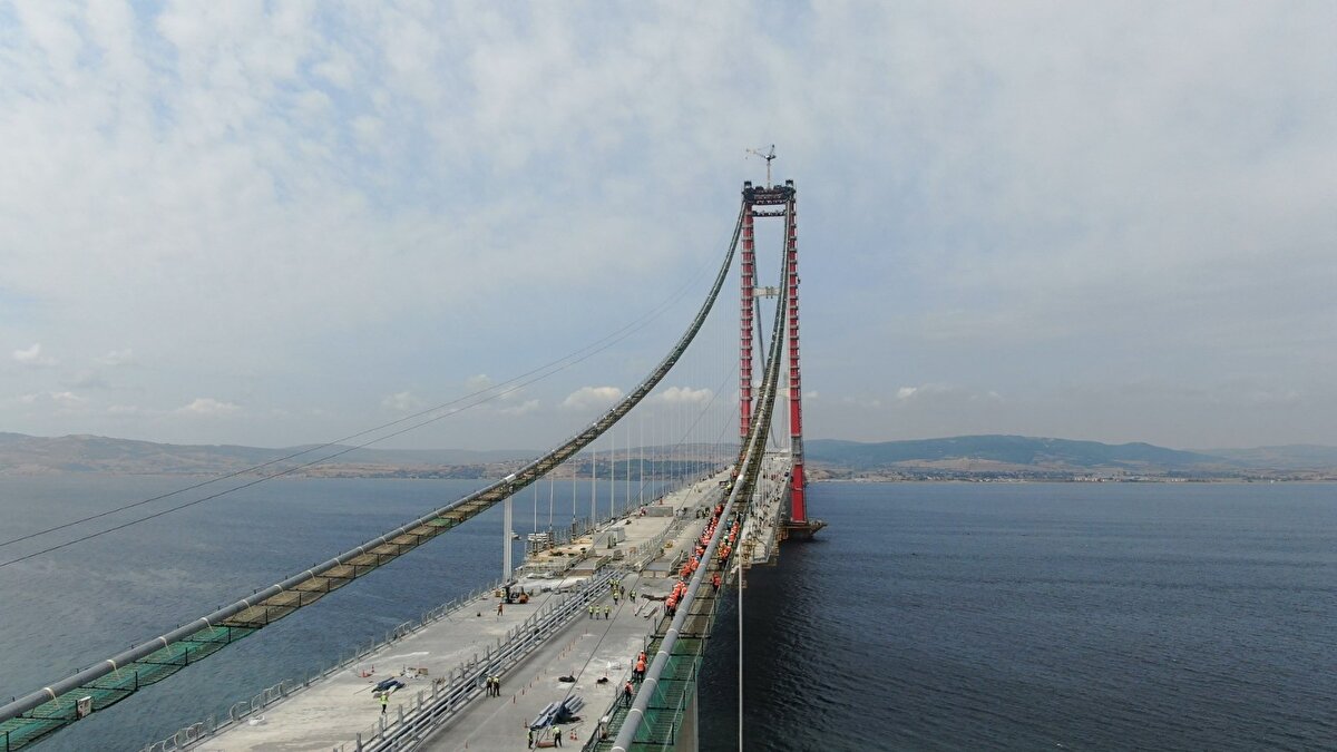 Karaismailoğlu, köprünün 2 bin 23 metre orta açıklık ve 770'er metre yan açıklıklarıyla 3 bin 563 metre uzunluğunda olduğunu belirterek, şunları kaydetti: "2 bin 23 metrelik orta açıklık, Cumhuriyetimizin 100. kuruluş yıl dönümünü sembolize ediyor ve tamamlandığında dünyanın en büyük orta açıklıklı asma köprüsü unvanına sahip olacak. 365 ve 680 metrelik yaklaşım viyadükleri ile beraber toplam geçiş uzunluğu ise 4 bin 608 metreye ulaşıyor. Köprümüzün 318 metrelik çelik kuleleri, Çanakkale Deniz Zaferi'nin kazanıldığı 18 Mart 1915'i işaret edecektir." Köprünün iki çelik kule arasında ikiz tabliye olarak tasarlanan nadir asma köprülerden biri olduğunu söyleyen Bakan,"Tamamlanınca, dünyada 2 bin metre orta açıklığın üzerinde ikiz tabliye olarak tasarlanan ve inşa edilen ilk köprü olarak tarihe geçecek. 318 metrelik kule yüksekliği ve 16 metrelik mimari amaçlı top mermisi figürüyle birlikte düşünüldüğünde deniz seviyesinden 334 metre yüksekliğe erişecek ve dünyanın en yüksek kulelerine sahip asma köprüsü olacak" dedi.