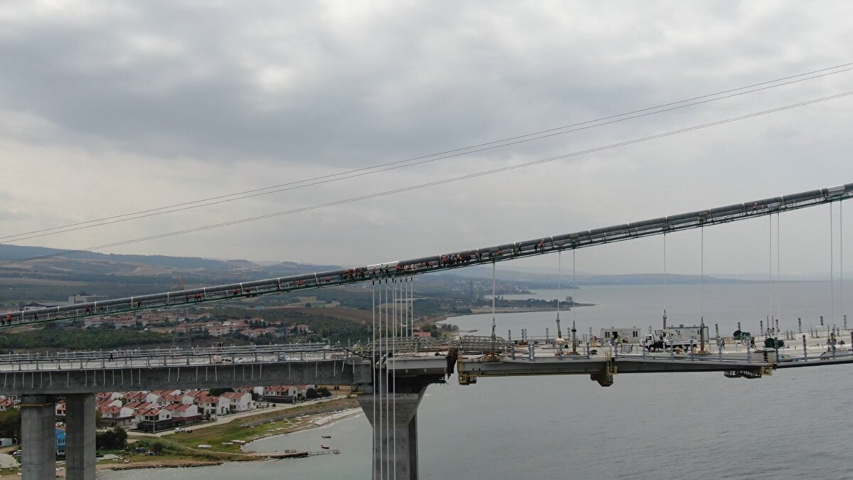 Kule kesonlarının konumlandırıldığı alanda deniz dibi tarama çalışmalarının yapıldığını ifade eden Karaismailoğlu, şunları kaydetti: "Kule keson temellerinin konumlandırıldığı alandaki deniz tabanında zemin iyileştirmesi için güney kulede 165 adet, kuzey kulede ise 203 adet olmak üzere toplam 368 adet 2,5 metre çapındaki çelik kazık çakıldı. Ana kablo imalatları tamamlanarak, 304 adet tel demetinden oluşan ana kablonun 5 Şubat 2021 tarihinde montaj çalışmalarına başlanılarak, montaj, ön sıkıştırma ve nihai sıkıştırma çalışmaları ile askı kelepçeleri ve düşey askı halatlarının montaj çalışmaları tamamlandı. Tabliye panel ve blok imalatları yapıldı. Montajları tamamlanan 66 adet mega blok, 21 adet single blok, Gölcük Çimtaş Tesisleri'nden Gelibolu Kuru Havuz Bölgesi'ndeki tabliye stok sahasına intikal ettirildi."
