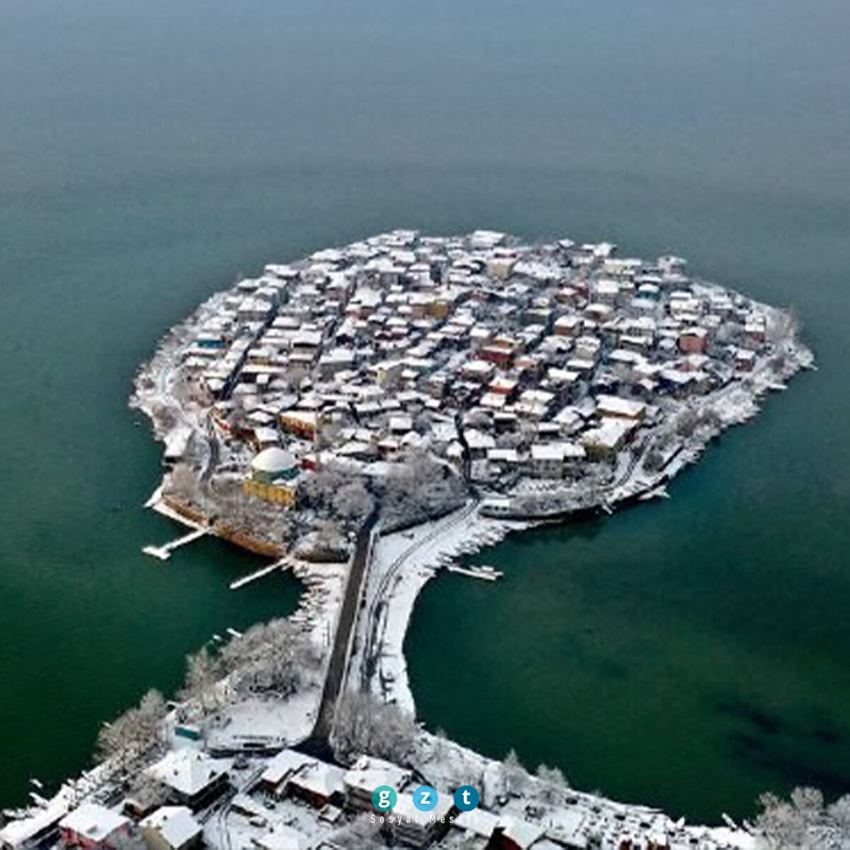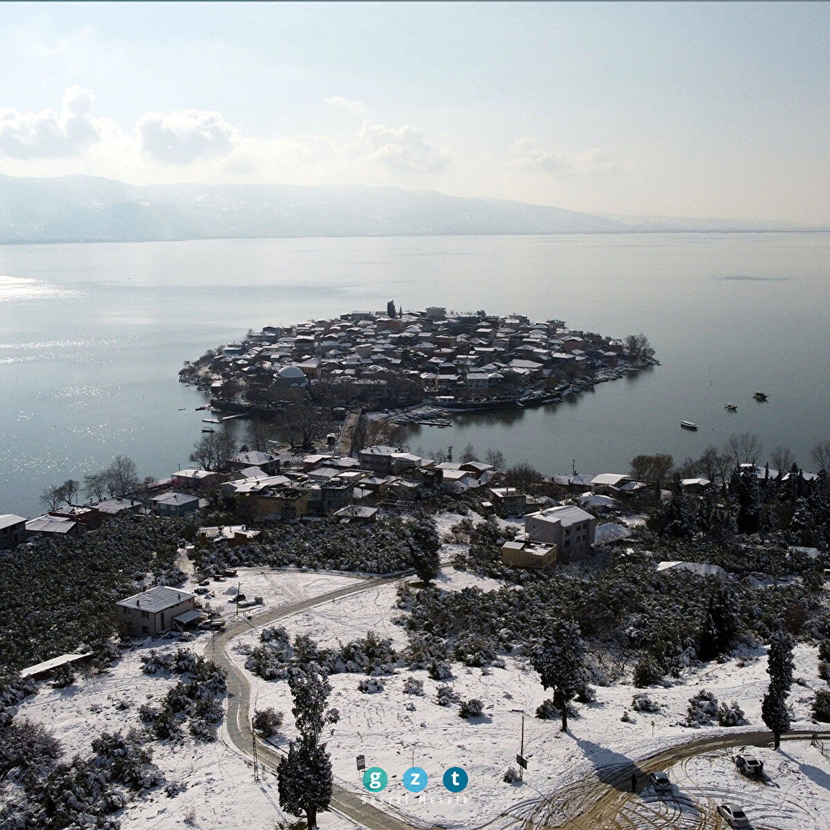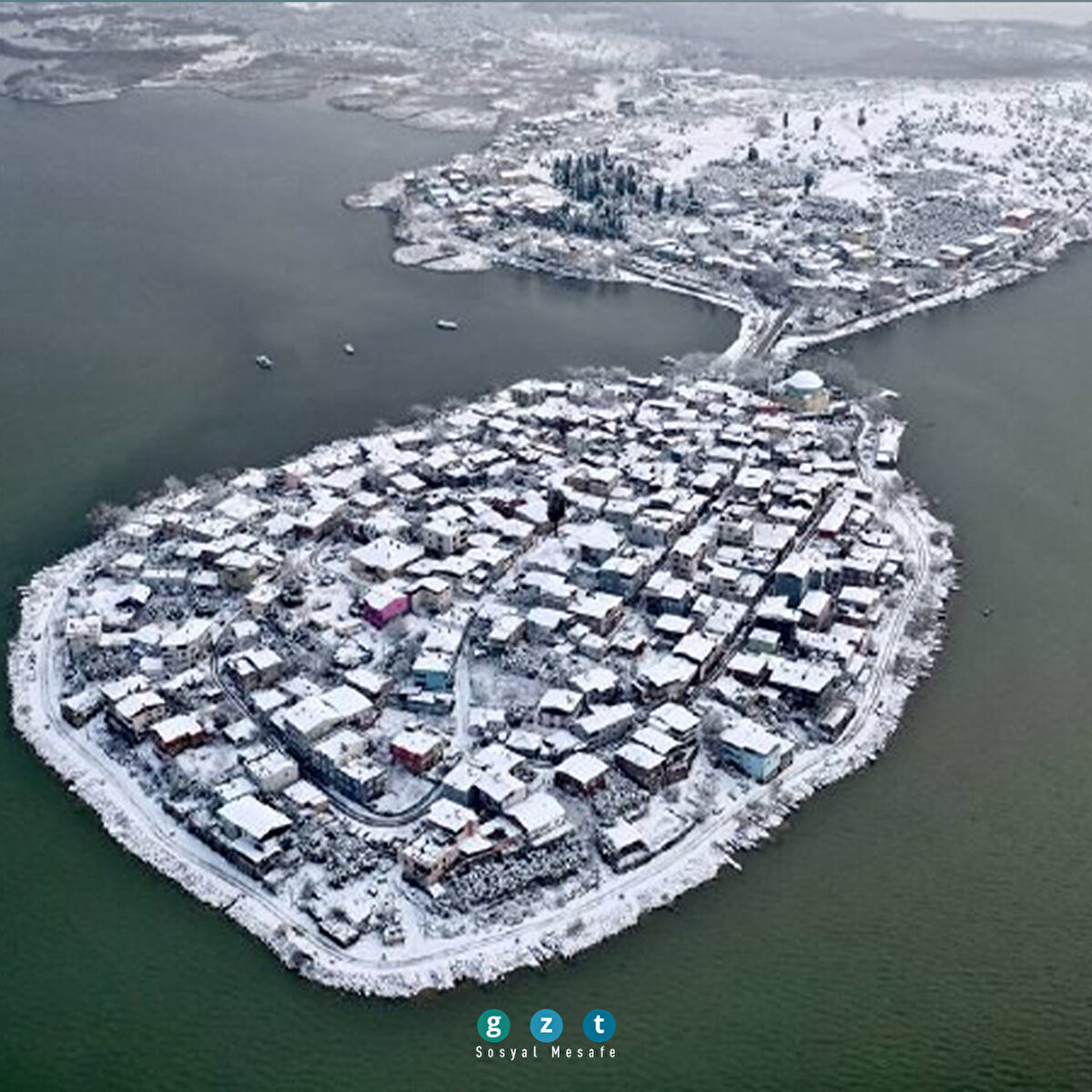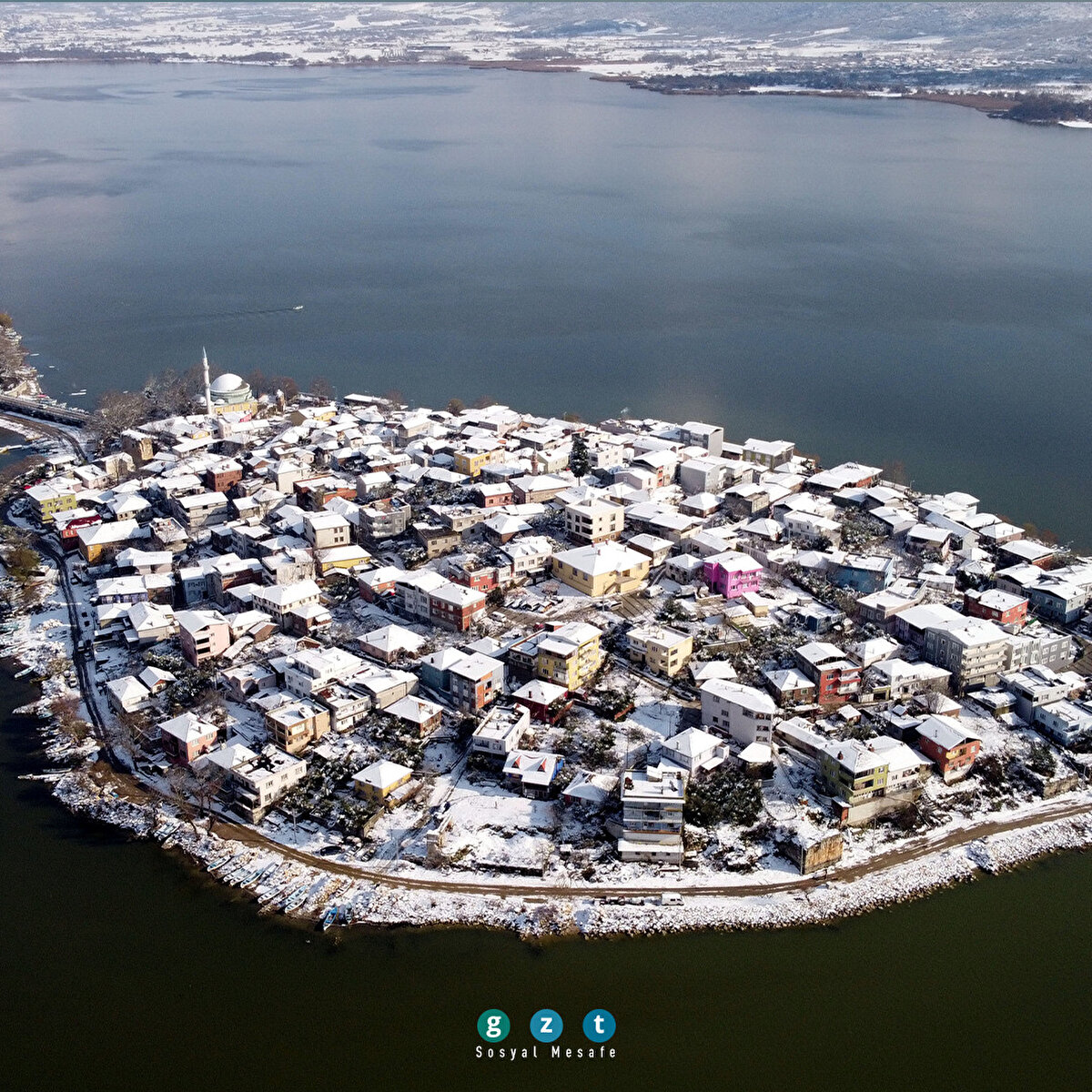 Türkiye'nin Venedik'i olarak bilinen ve Japonların görülmesi gereken dünyanın sayılı 30 kasabası arasına koyduğu Gölyazı, beyaz kar örtüsüyle görenleri hayran bırakıyor. Fotoğrafçıların uğrak yeri olan küçük Venedik'in en güzel anlarını drone pilotları böyle görüntüledi. Bursa'nın Nilüfer ilçesinde, Uluabat Gölü kıyısındaki Gölyazı Mahallesi, hafta sonundan itibaren süren yoğun kar yağışı ile beyaza büründü. Yaklaşık 2 bin 600 yıl önce hayatın başladığı, Nilüfer çiçeği ve balıkçı kadınlarıyla meşhur Gölyazı, karla kaplı görüntüsüyle de büyük ilgi gördü. Özellikle kışın göl suyunun yükselip evlerin kapılarına kadar geldiği dönemdeki görüntüsüyle Venedik'e benzetilen şirin kasaba, Japon Seyahat Acentaları Birliği tarafından da "Avrupa'nın en güzel 30 kasabası" arasında gösteriliyor. Bursa drone kulübü üyeleri Hüseyin Tuğrul ve Zeki Sevim tarafından görüntülenen beyazlar içerisindeki Gölyazı eşsiz güzelliği ile hayran bıraktı.