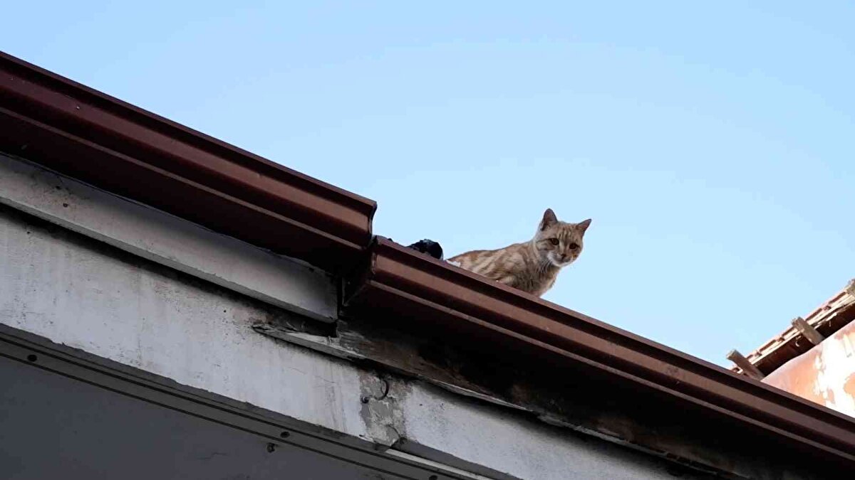 Çatıdaki kedinin beslenmesini ve yaşamını sürdürmesini sağlayan vatandaşlardan çay ocağı işletmecisi Muttalip Yavuz, “Bu kedi pandemi döneminden 2 veya 3 yıl önce karşı çatıdan buraya atladı, o gün bu gündür bunu bu çatıdan indiremiyoruz" dedi.