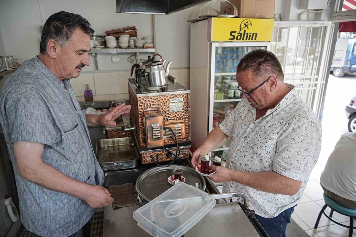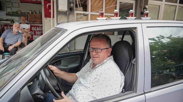 Bursa'da esnaflık yapan Ali İhsan Olcay, çaylarını 50 metre mesafedeki çay ocağından otomobiliyle taşıyor. Olcay, hem pratik olduğu hem de espri amaçlı tercih ettiği bu yöntemle şimdiye kadar hiç çay dökmediğini söylüyor.