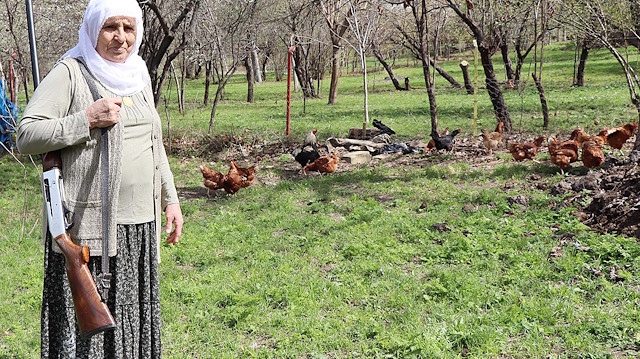 Erzurum'un Olur ilçesinde Gülistan Kurt (68), tavuklarını çakallardan korumak için elinde tüfekle nöbet tutuyor. Kırsal Ormanağzı Mahallesi'nde oturan Gülistan Kurt, evinin bahçesinde beslediği tavuklardan 20'sini çakallar yiyince, elinde tüfek nöbete başladı.