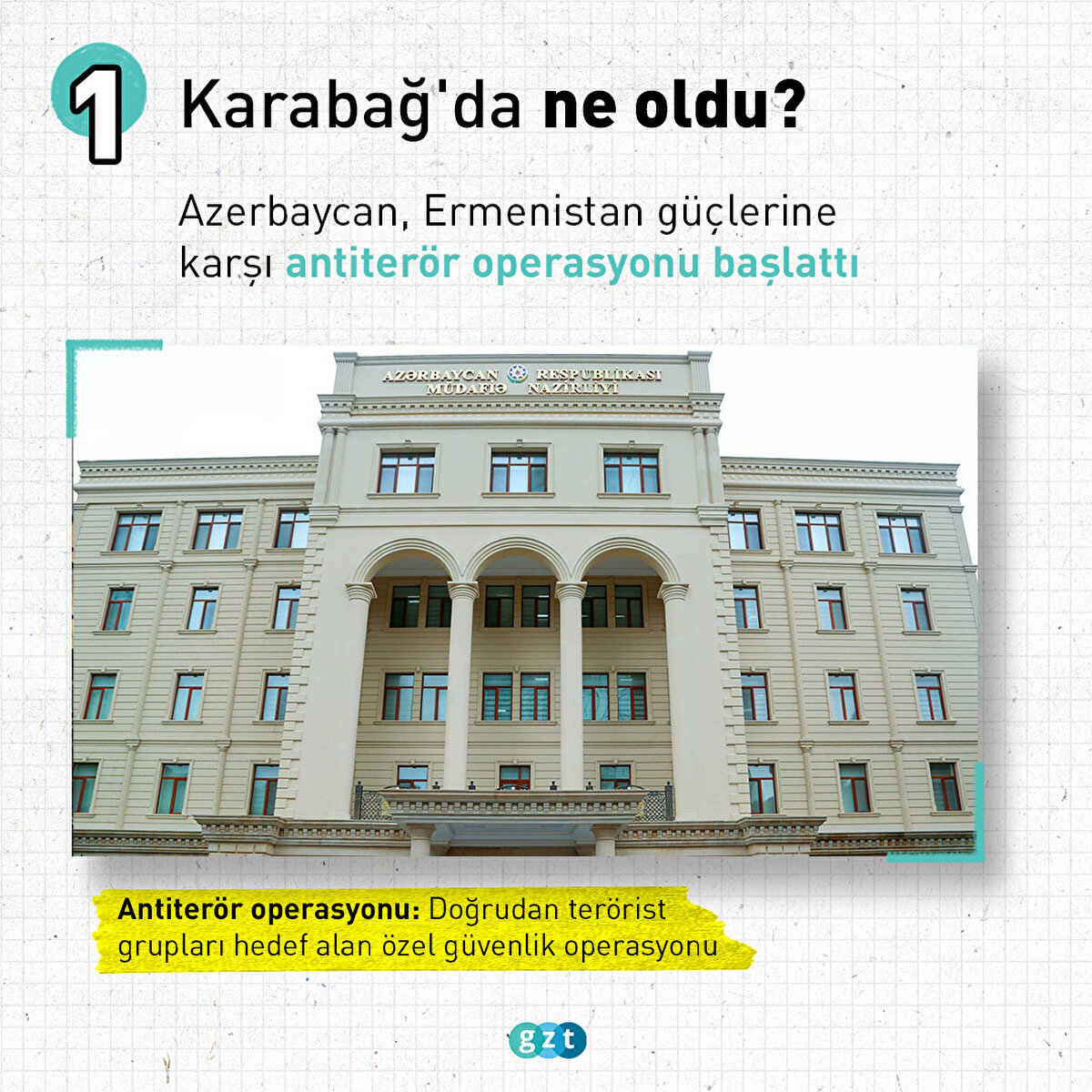 Azerbaycan Savunma Bakanlığı, Karabağ'da anayasal yapıyı yeniden tesis etmek amacıyla antiterör operasyonu başlatıldığını duyurdu. Operasyonda siviller ve altyapı tesislerinin hedef alınmadığına yalnızca meşru askeri hedeflerin yok edildiğine dikkati çekildi.