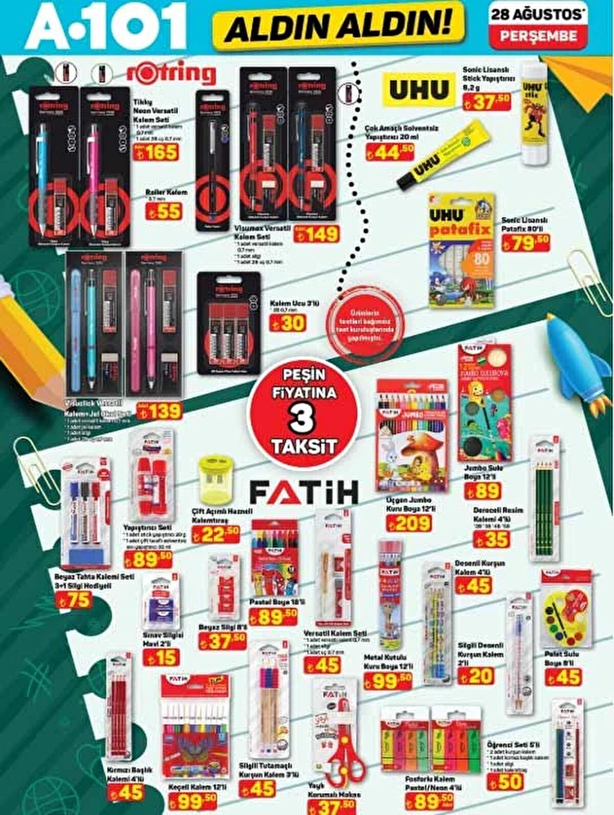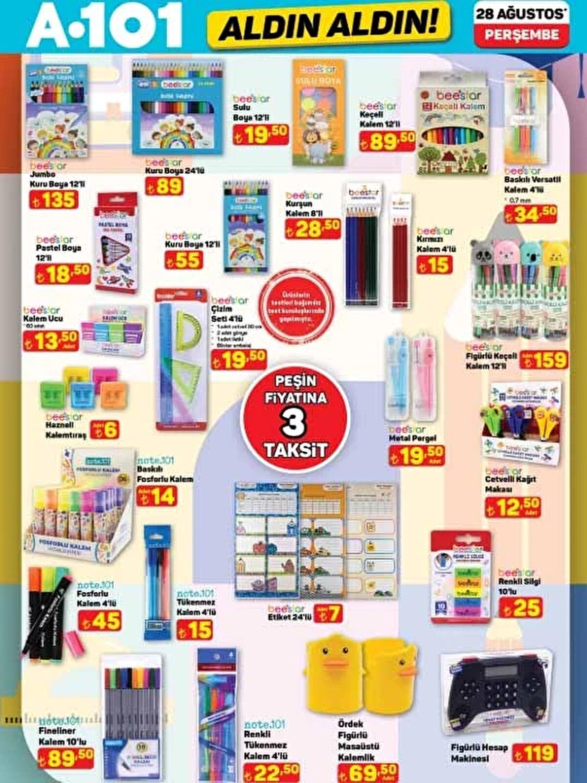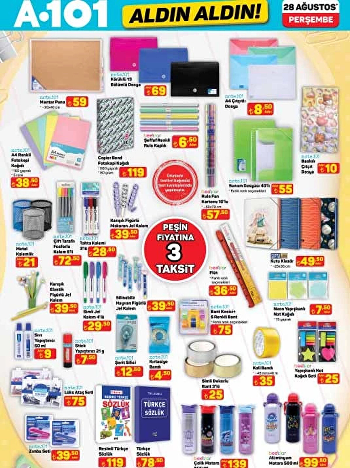 28 Ağustos 2025 A101 Aldın Aldın aktüel kataloğu yayınlandı! Okulların açılmasına kısa bir süre kala A101, öğrencilere ve ailelere özel kırtasiye ürünleri, okul çantaları, dijital su sebili, halı yıkama makinesi, şarjlı masaj aleti ve daha birçok indirimli ürünü raflara taşıyor. İşte A101 okul malzemeleri ve aktüel ürünler listesi!