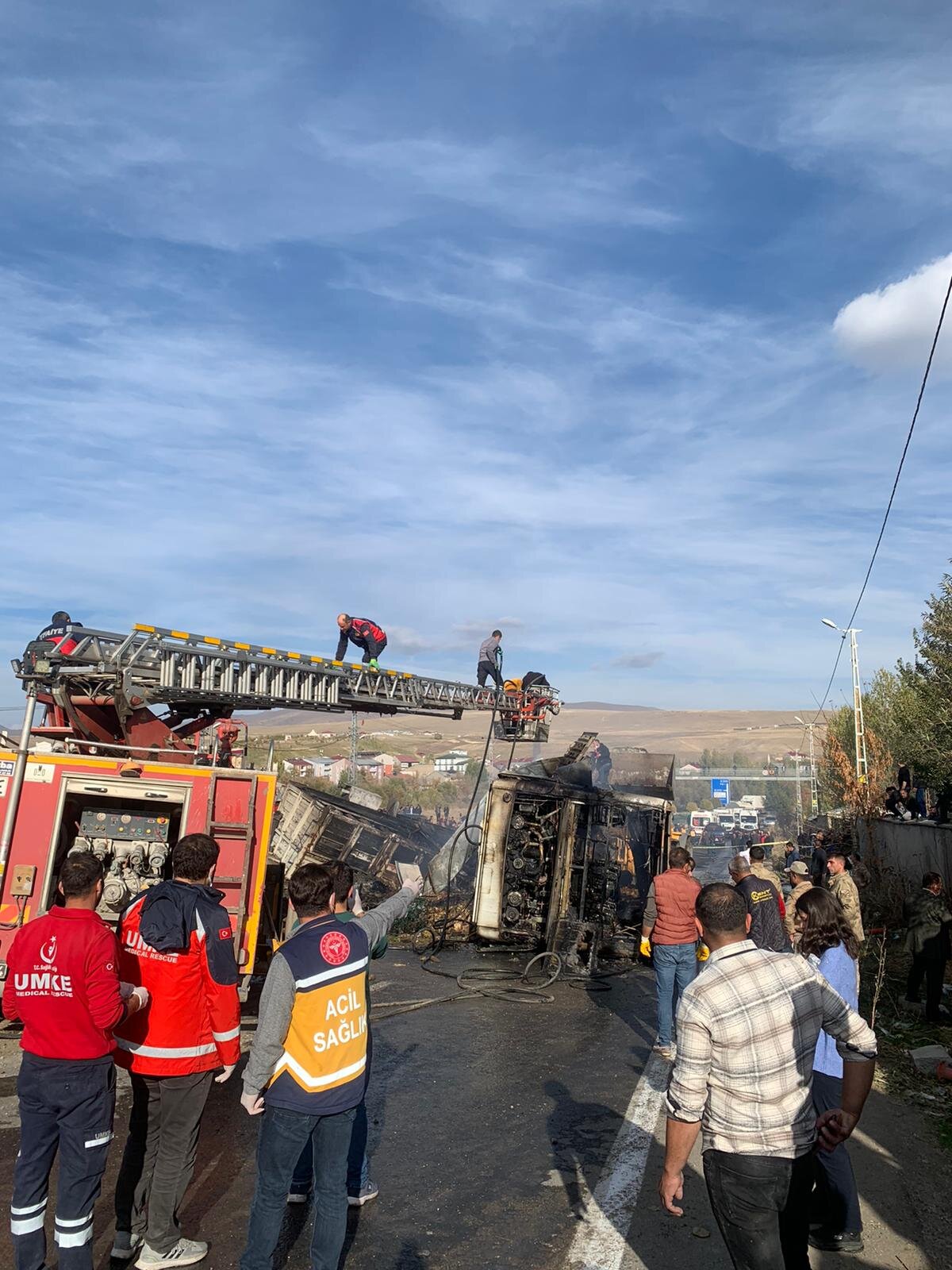 İtfaiyeden alınan bilgilere göre, 4 kamyon, 1 iş makinesi ve 1 yolcu otobüsünün karıştığı zincirleme kaza meydana geldi. Çarpmanın etkisiyle araçlar da alev aldı.