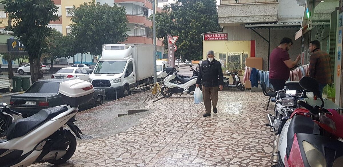 Cadde ve sokaklar 10 dakika süren kar ve dolu yağışı ile beyaza bürünürken merkezde bulunan sera ve narenciye ağaçları zarar gördü.