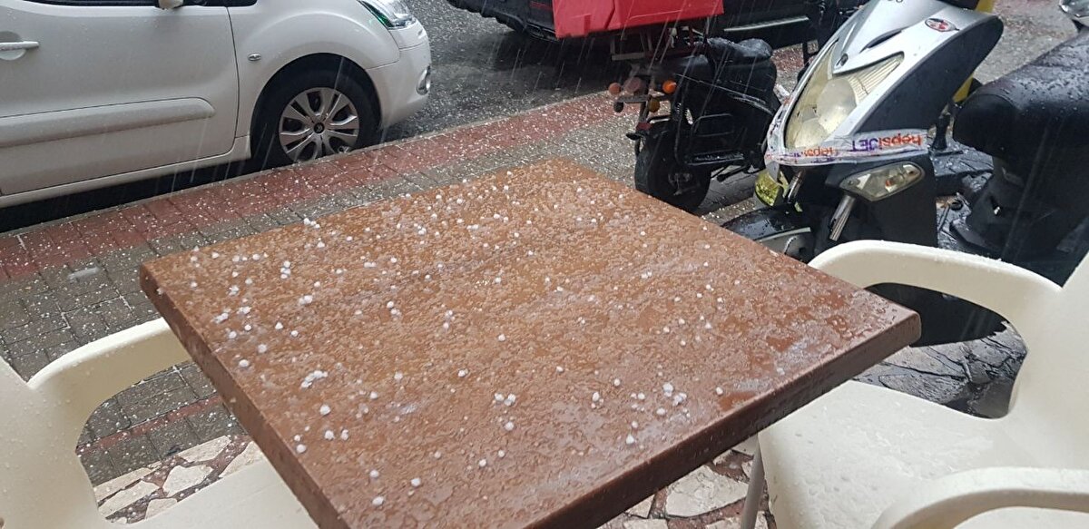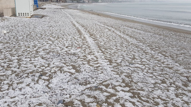 Karla karışık yağan dolu, turistlerin gözdesi Alanya plajını 10 dakika içerisinde beyaz örtüyle kapladı.