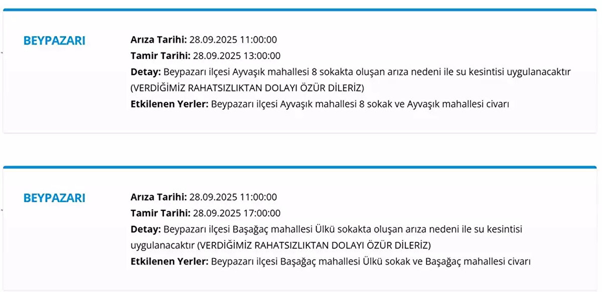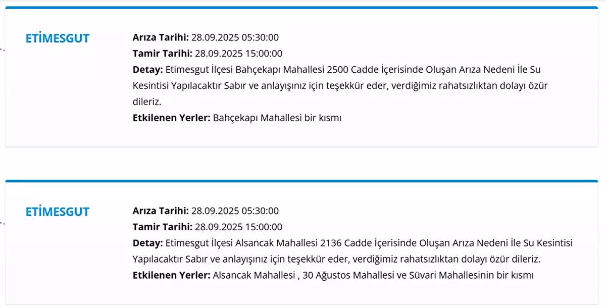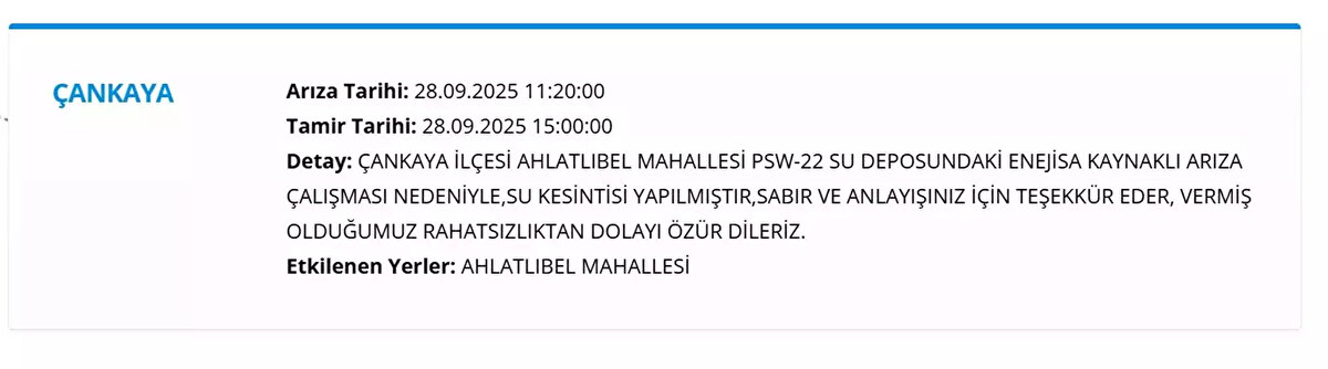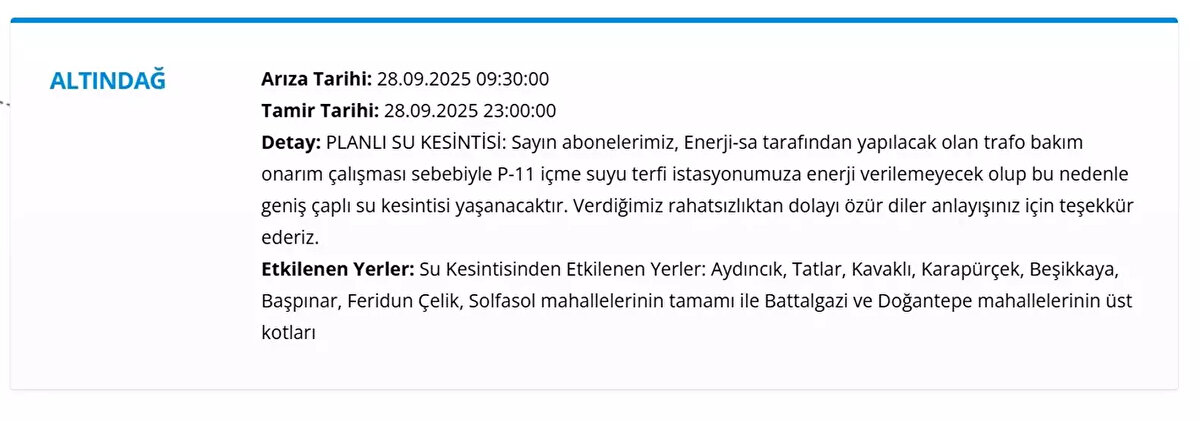 ASKİ’nin açıklamasına göre, 28 Eylül Pazar günü başlayan su kesintisi, en geç gece saat 00:00’a kadar sona erecek. Kesintiden etkilenen vatandaşların, bu süre zarfında su ihtiyacını karşılamak üzere gerekli önlemleri alması öneriliyor.