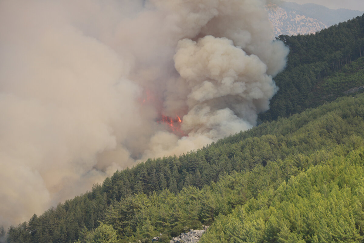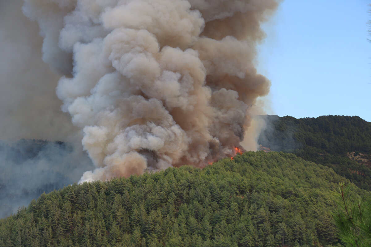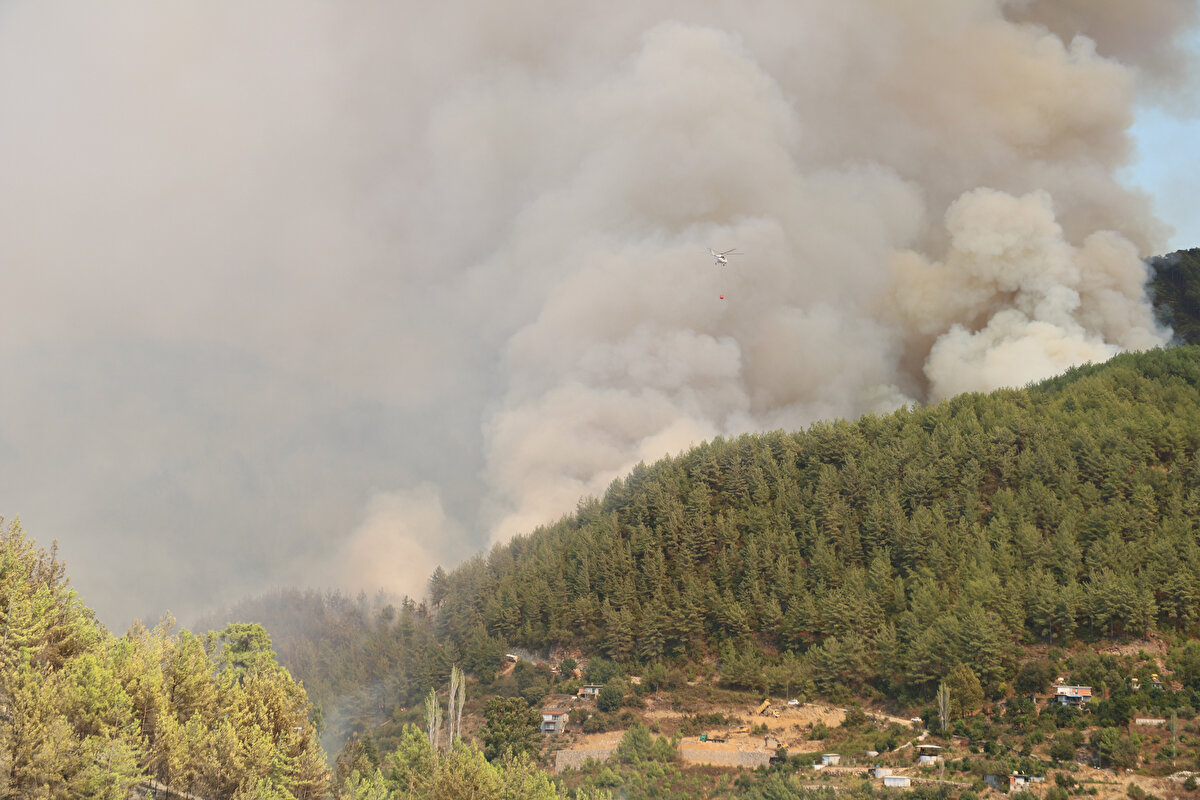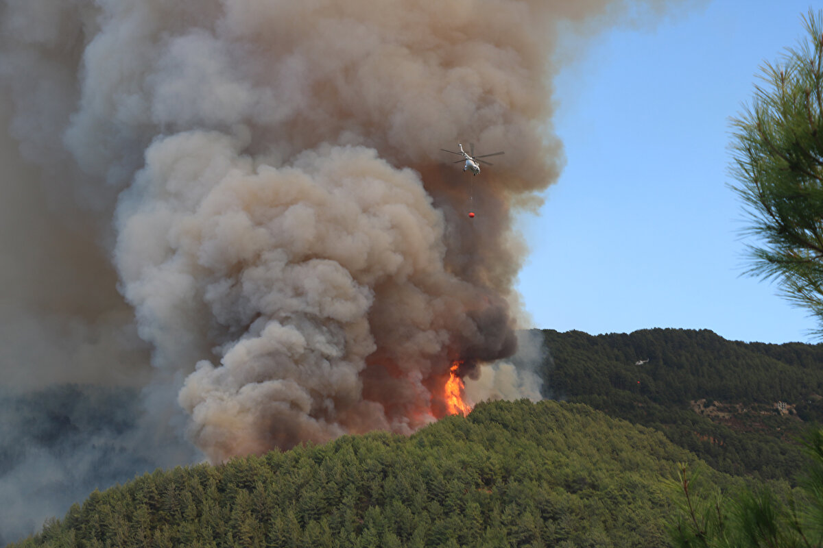 Yangın Dim Barajı'nın arka tarafına doğru ilerlerken, bölgeye çok sayıda kara ekibinin yanı sıra yangın söndürme helikopterleri de yönlendirildi.