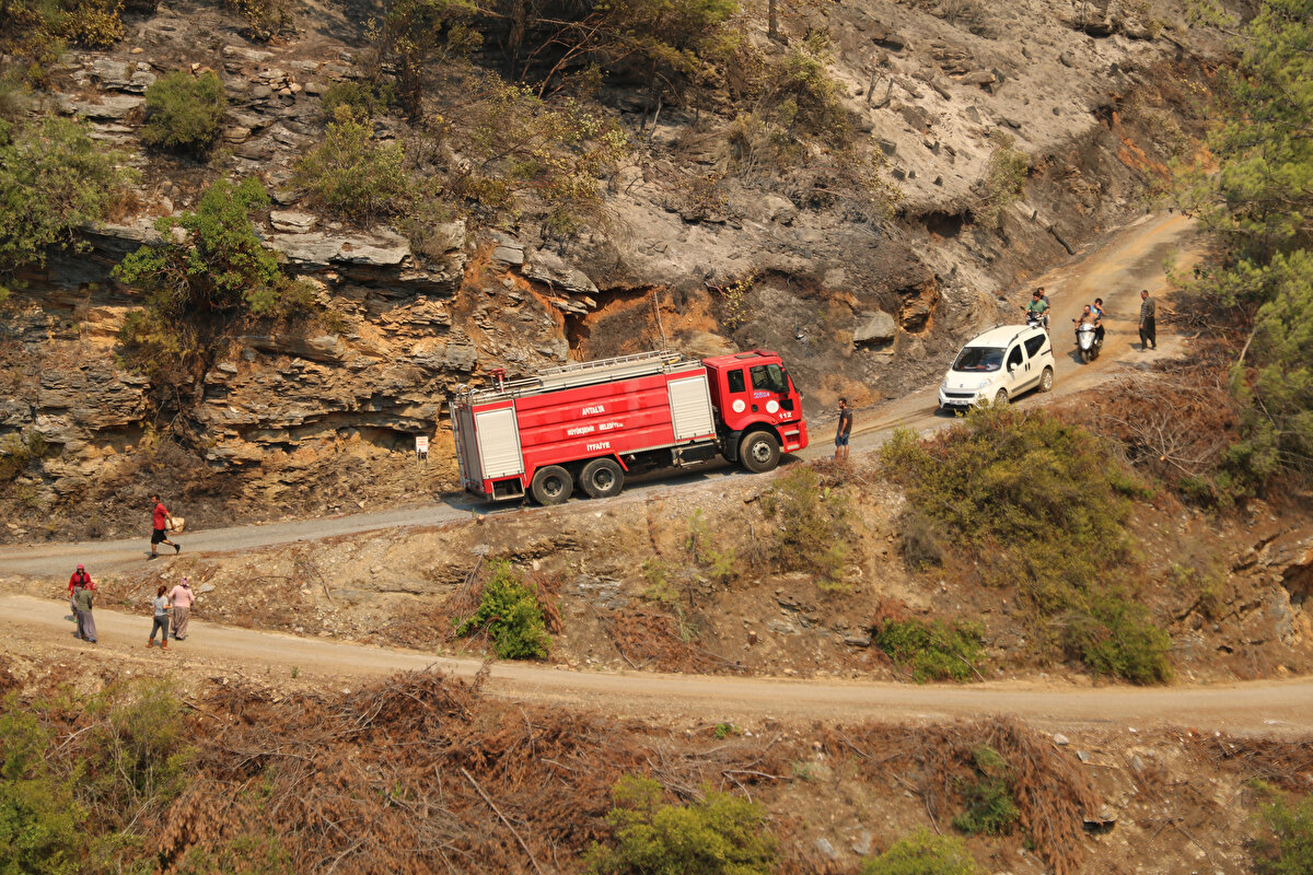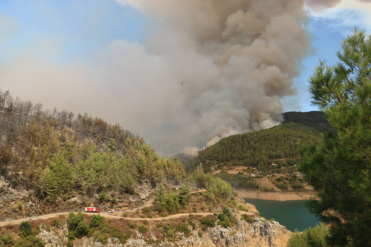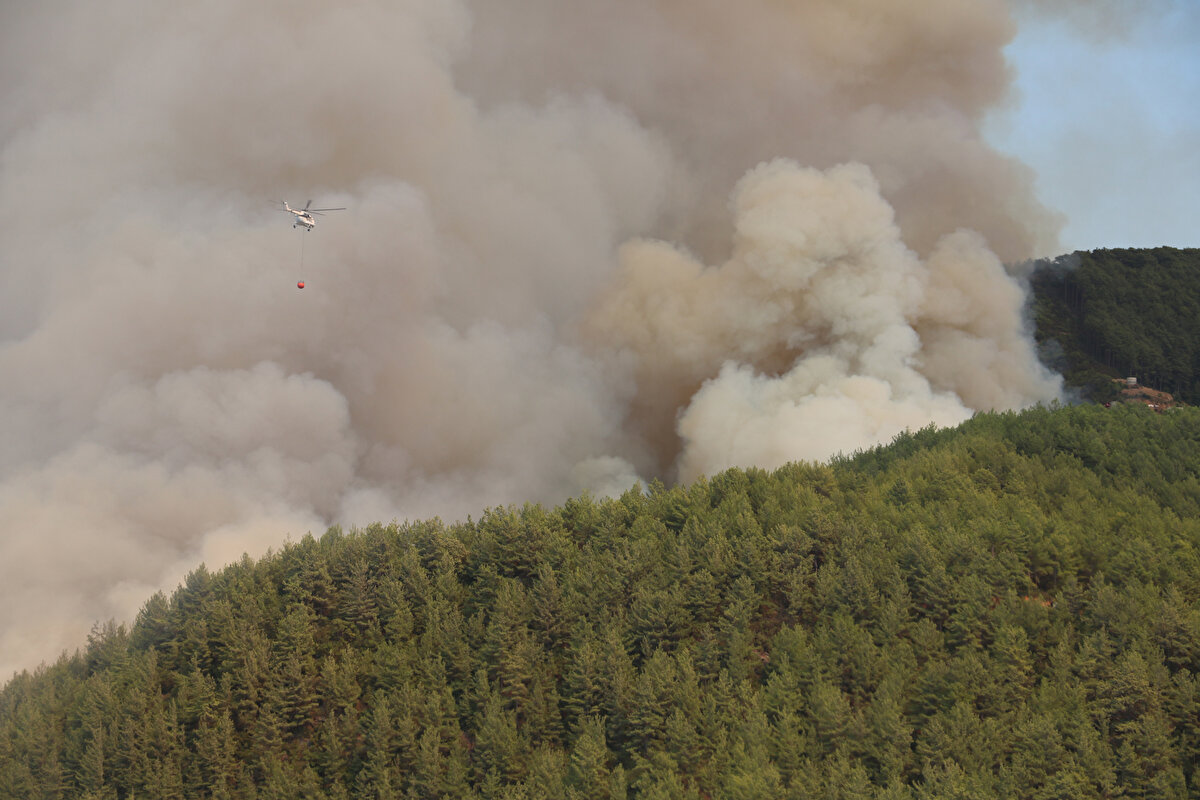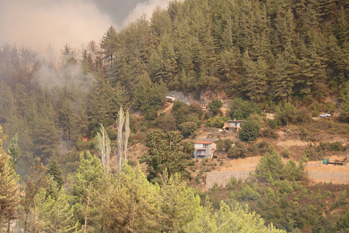 Yangın Dim Barajı'nın arka tarafına doğru ilerlerken, bölgeye çok sayıda kara ekibinin yanı sıra yangın söndürme helikopterleri de yönlendirildi.