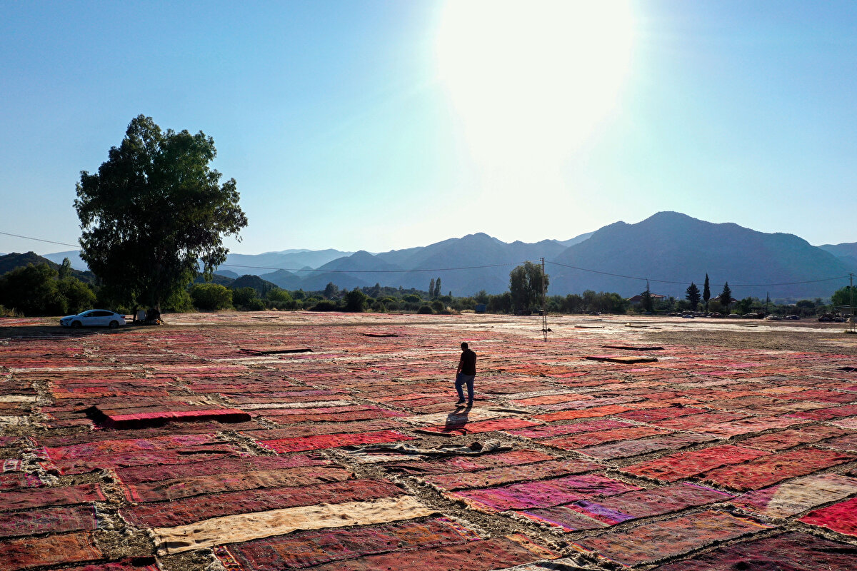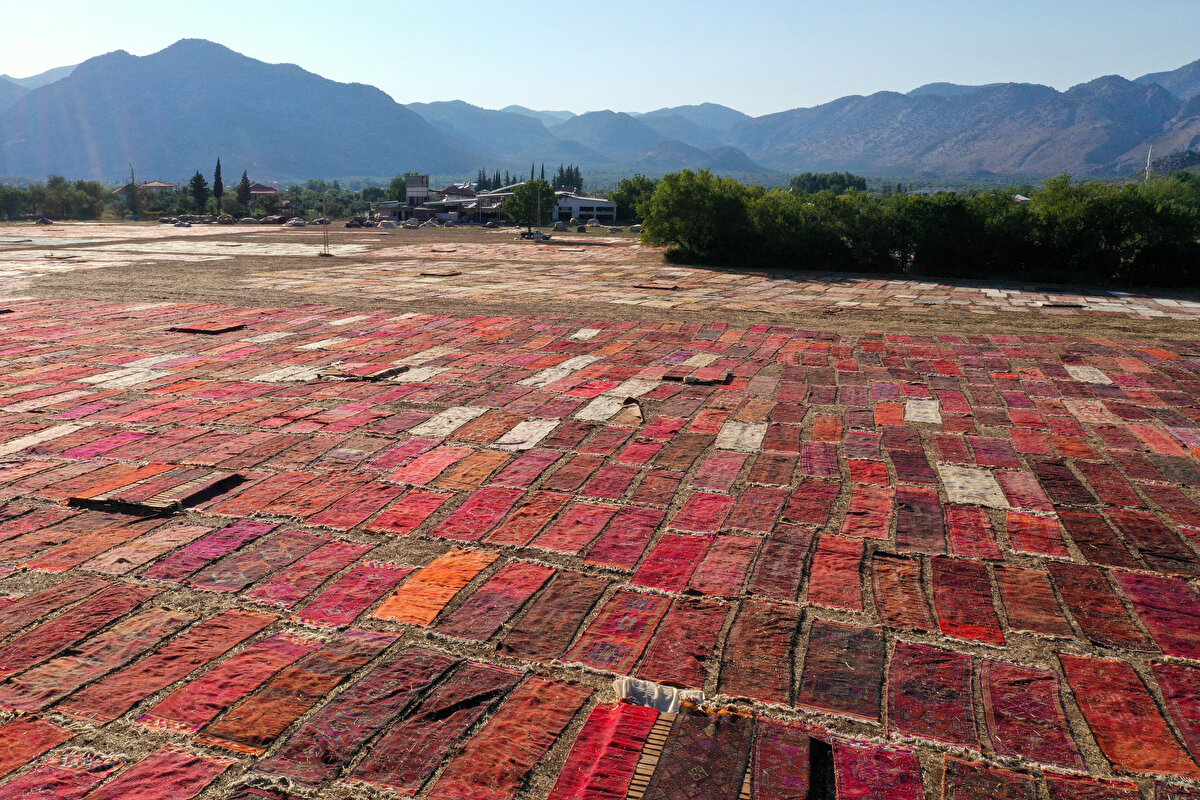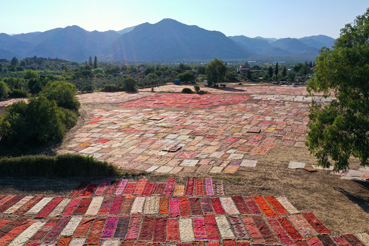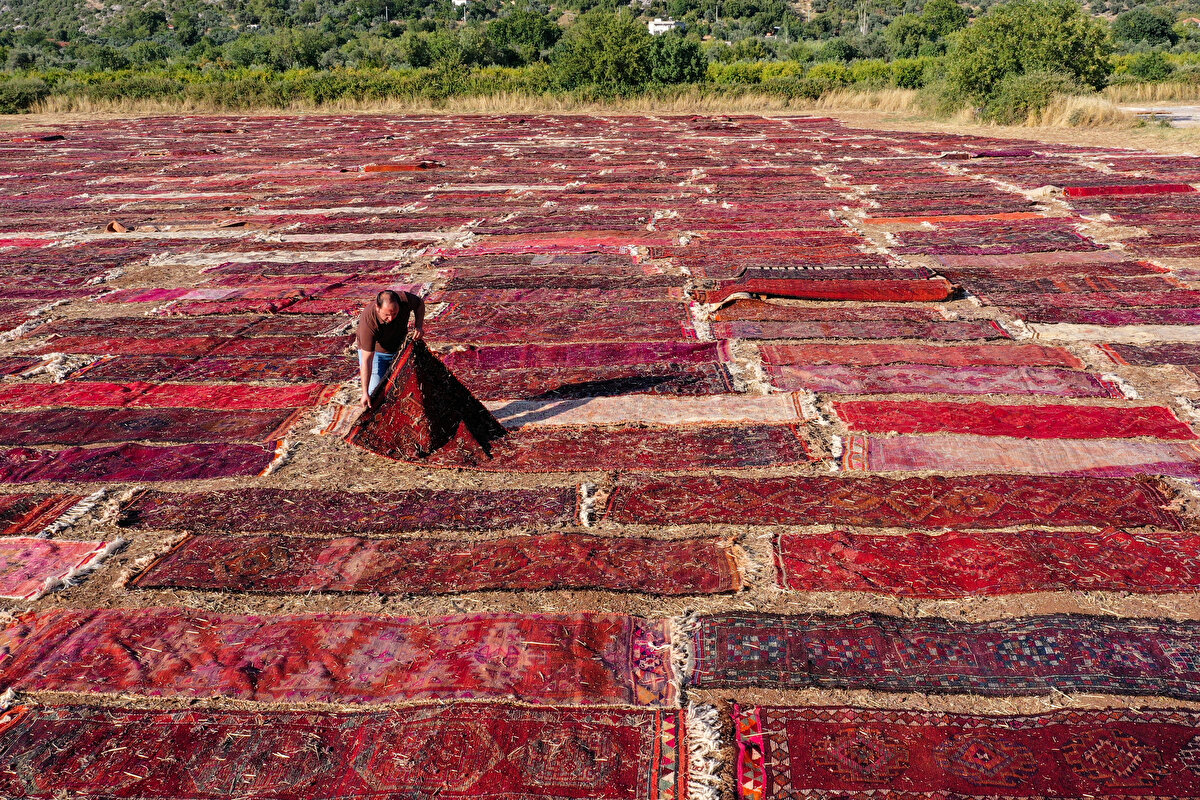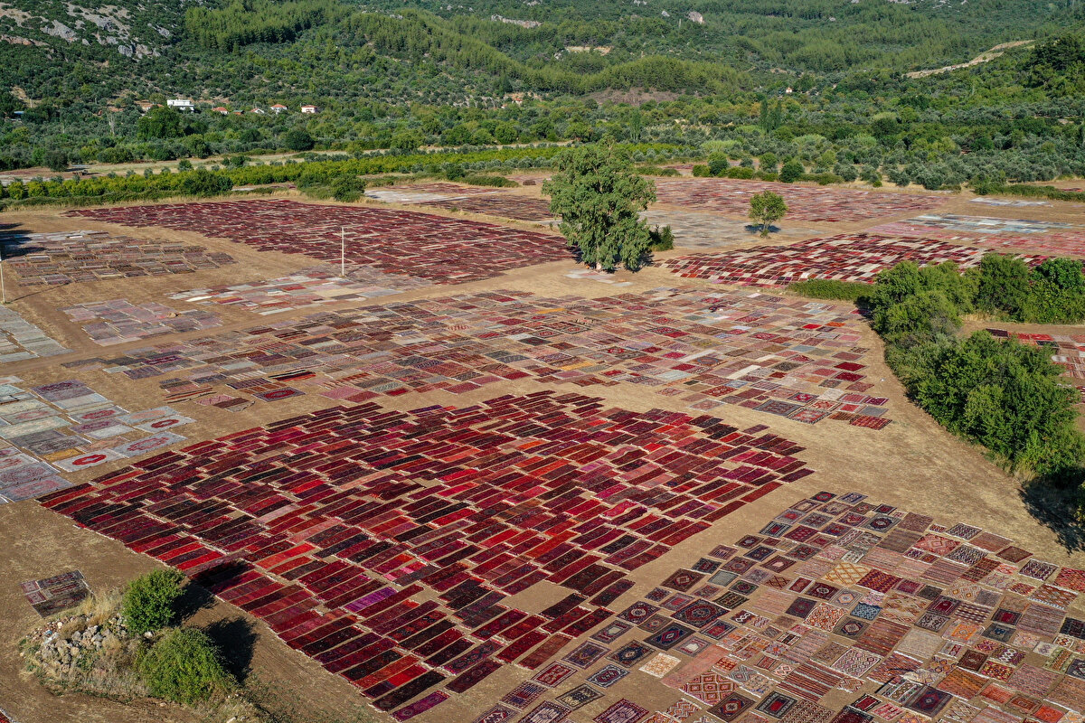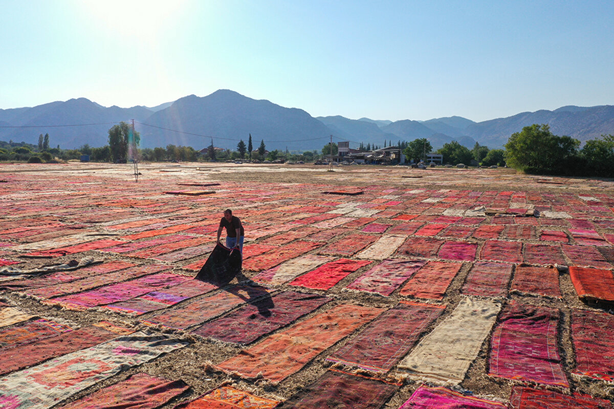 Yağışlı havalarda depolara kaldırılan el dokuması halı ve kilimler, güneşin kendisini göstermesiyle yeniden tarlalardaki yerini alıyor. Zaman zaman rüzgar nedeniyle ters dönen, kıvrılan halılar hemen düzeltiliyor, belli aralıklarla da tozlarından arındırılıyor.