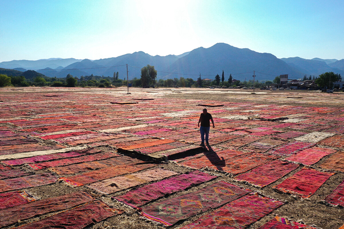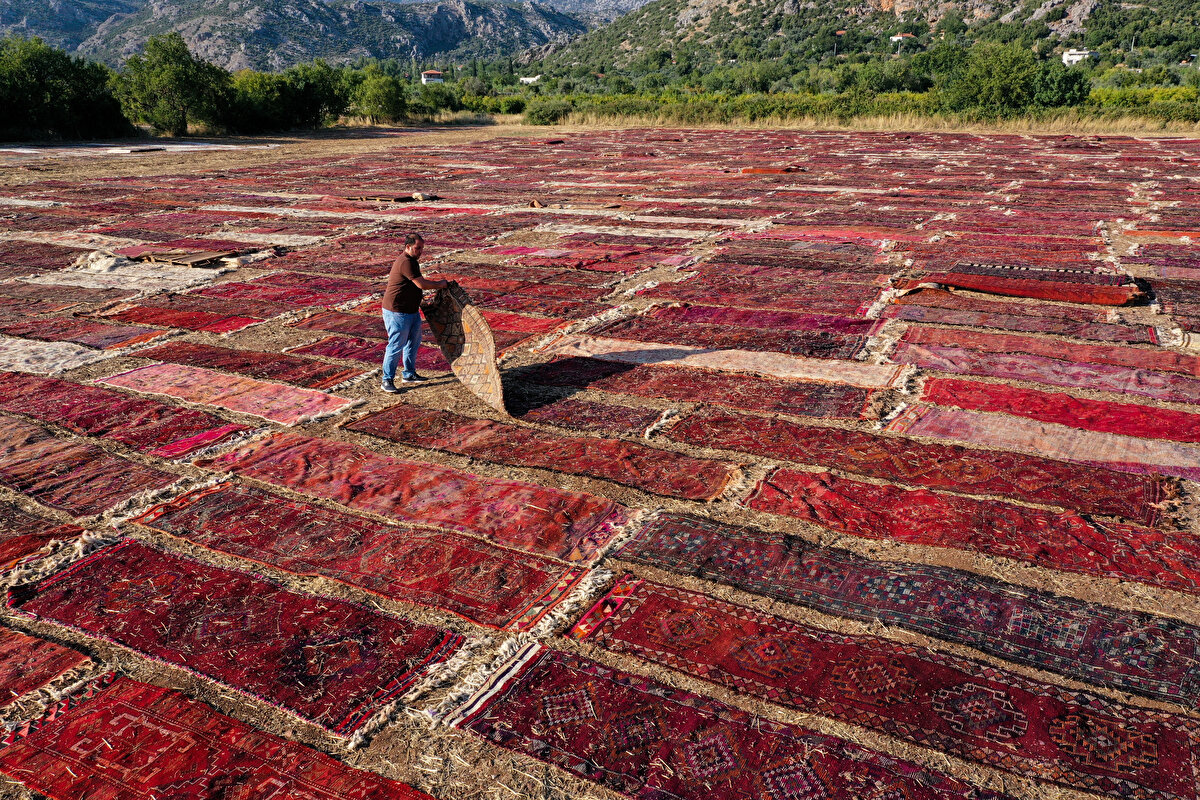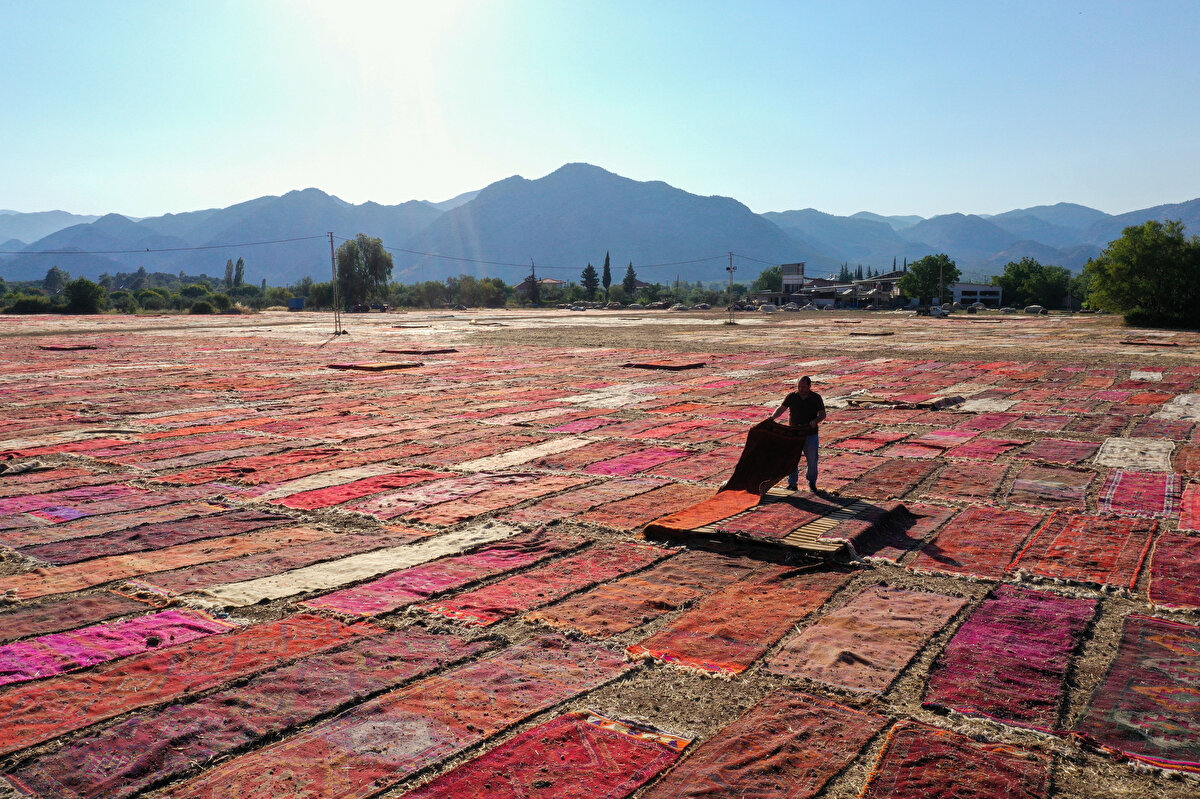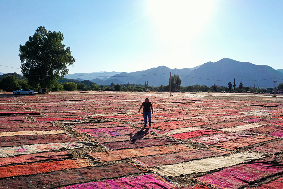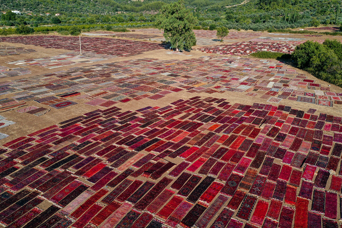Yağışlı havalarda depolara kaldırılan el dokuması halı ve kilimler, güneşin kendisini göstermesiyle yeniden tarlalardaki yerini alıyor. Zaman zaman rüzgar nedeniyle ters dönen, kıvrılan halılar hemen düzeltiliyor, belli aralıklarla da tozlarından arındırılıyor.