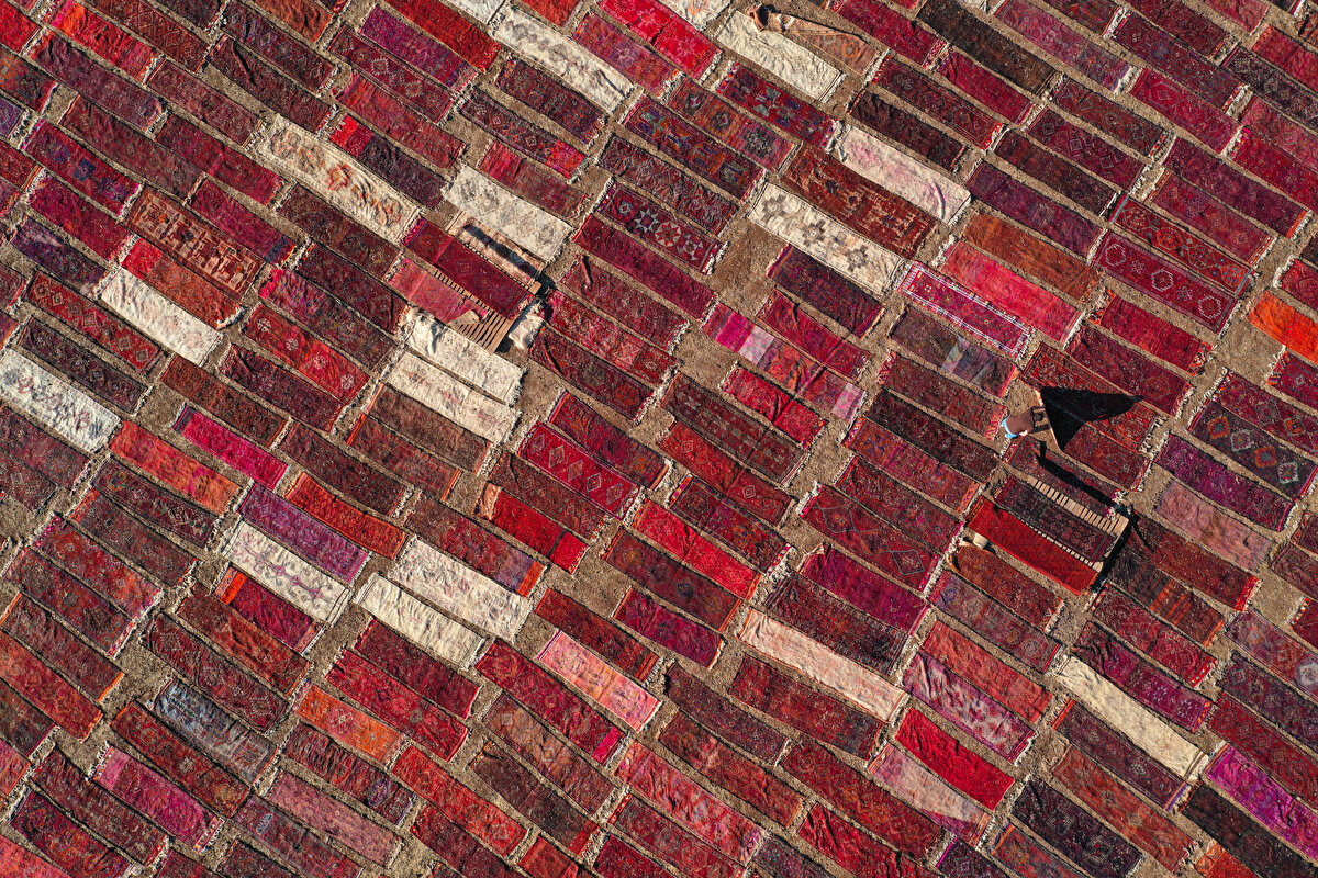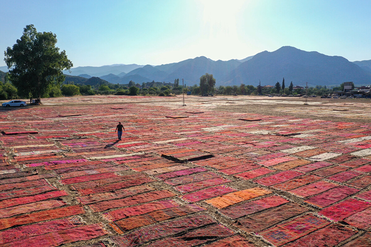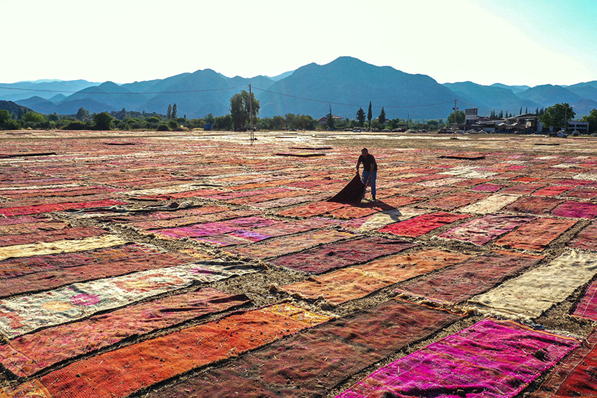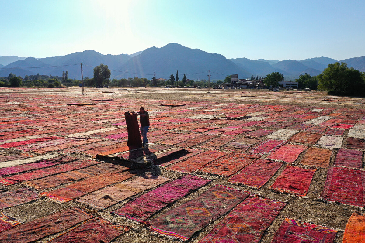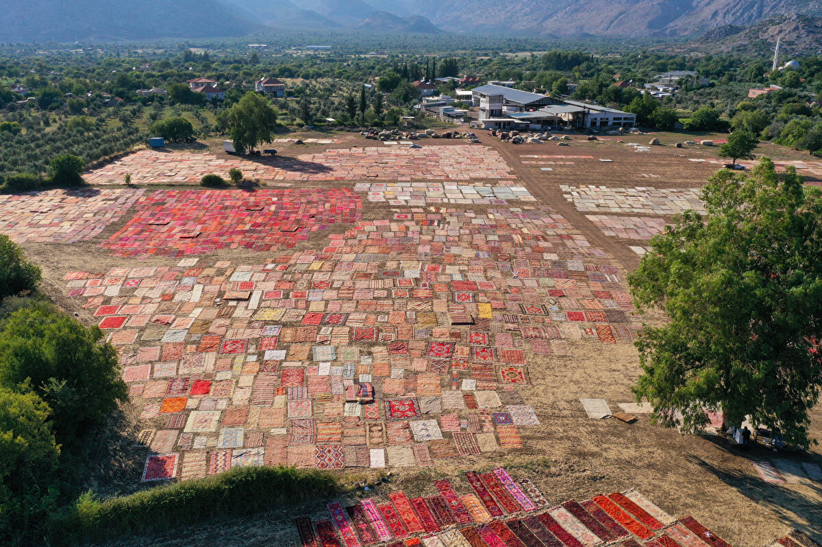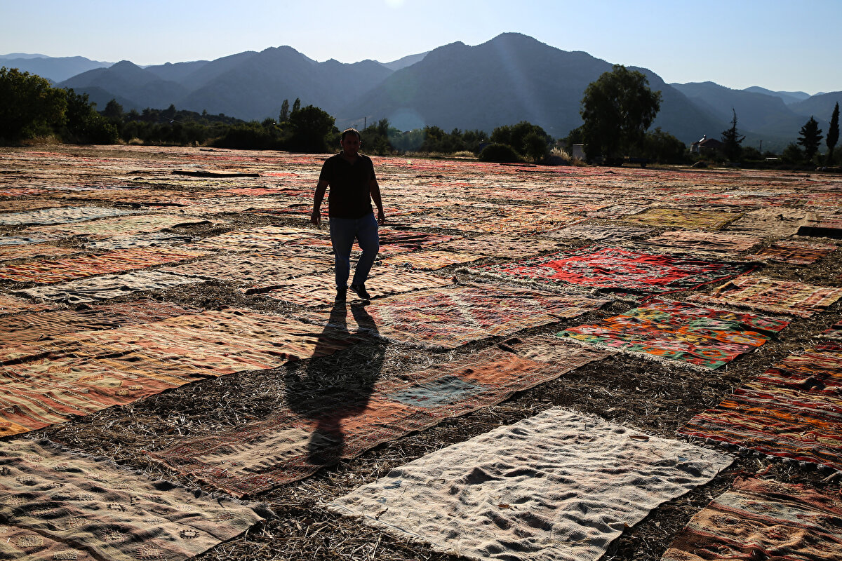 Yağışlı havalarda depolara kaldırılan el dokuması halı ve kilimler, güneşin kendisini göstermesiyle yeniden tarlalardaki yerini alıyor. Zaman zaman rüzgar nedeniyle ters dönen, kıvrılan halılar hemen düzeltiliyor, belli aralıklarla da tozlarından arındırılıyor.