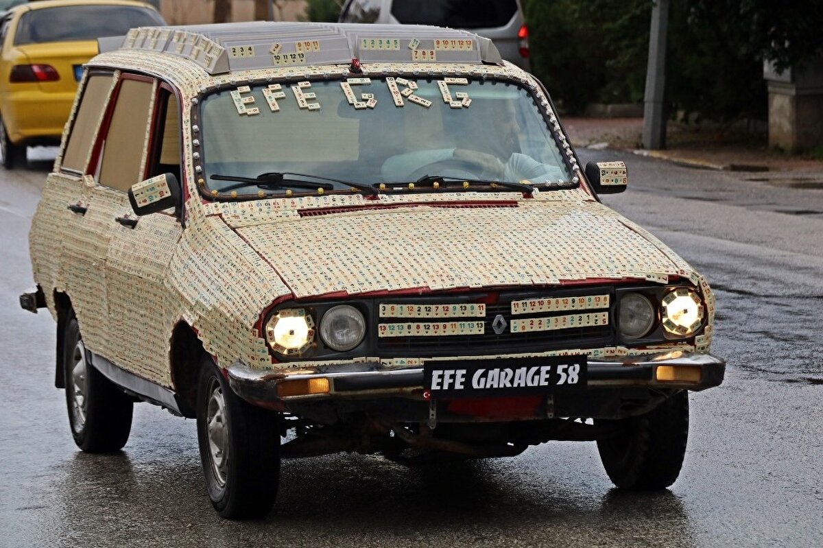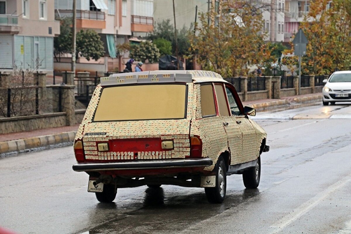 Antalya'da aracının üstünü kesip havuza dönüştürdükten sonra başka bir aracının üzerini teras gibi kullanarak bagaj kısmında mangal keyfi yapan şans oyunu milyoneri oto aksesuarcı Murat Tokmak, bu sefer hurdacıdan aldığı bir otomobilin etrafını okey taşlarıyla kapladı.