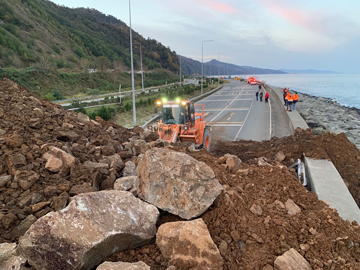 Heyelan nedeniyle yamaçtan kopan dev toprak ve kaya kütleleri Karadeniz Sahil Yolunun çift yönlü olarak ulaşıma kapanmasına neden oldu.