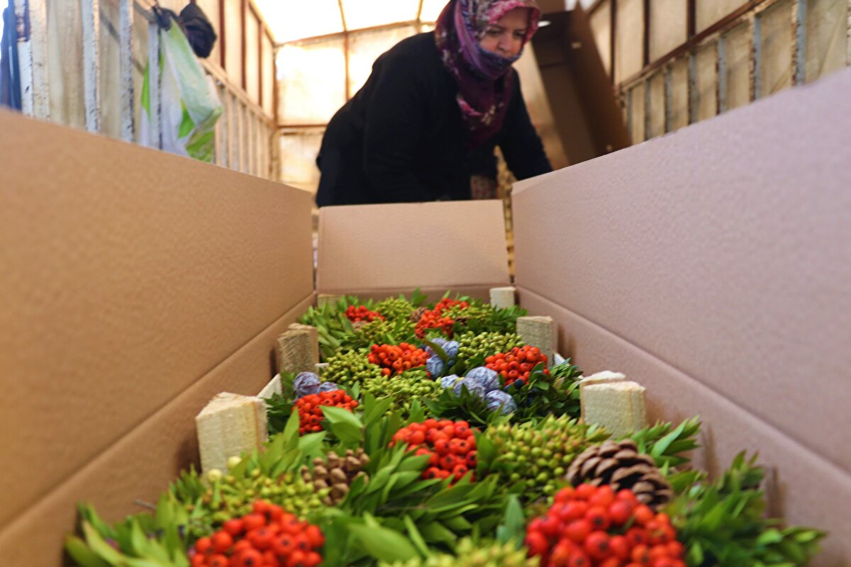 Ağustos-aralık döneminde yılbaşı için kapı süsü üreten kadınlar, bir çelenkten 4 lira 50 kuruş kazanıyor, her bir kadın günde en az 30, en fazla 100 çelenk hazırlıyor.