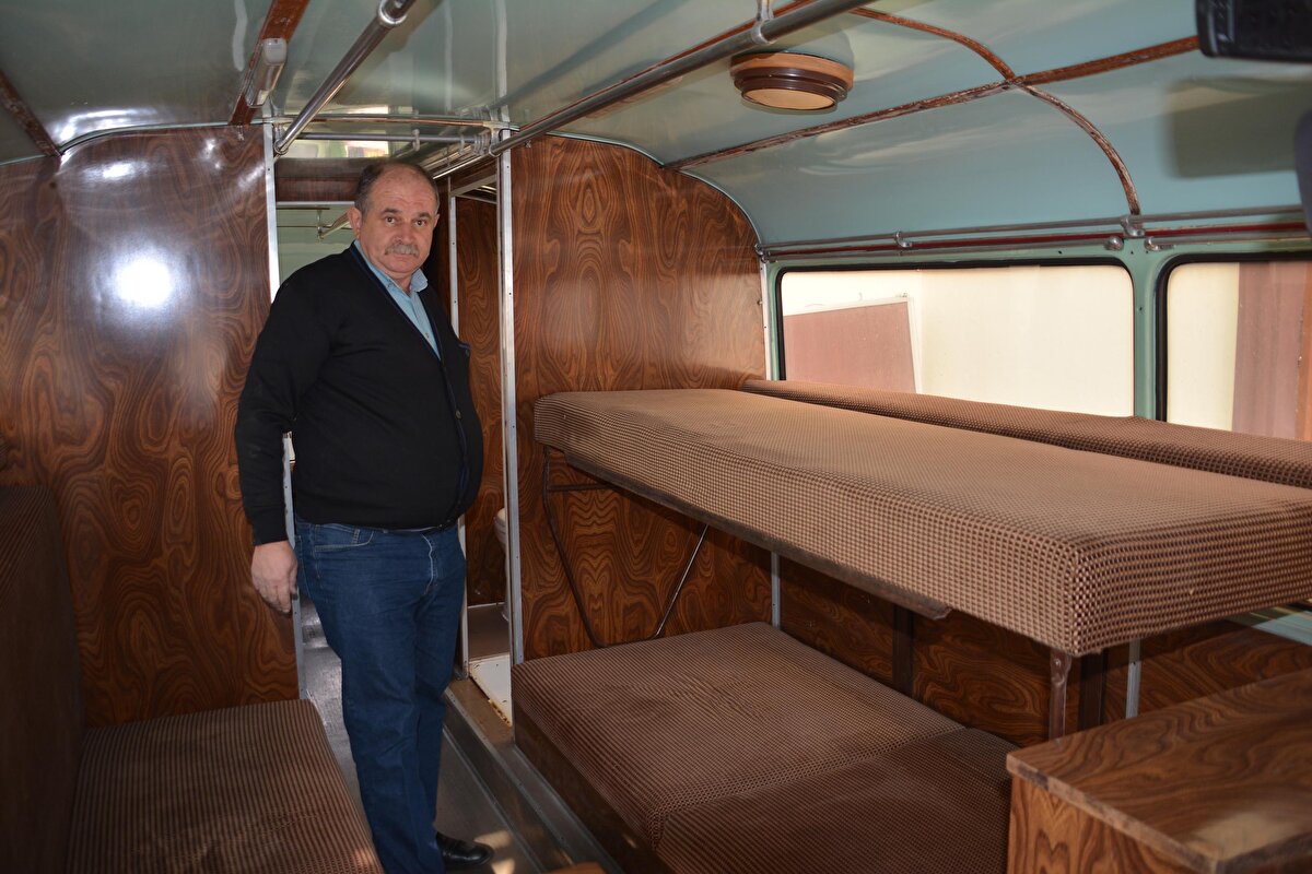 Kayseri'de iş insanı Ahmet Doğan Çelebi (61), babası Doğan Çelebi'nin 1977 yılında Erzurum'dan satın aldığı ve içini karavana çevirdiği 1955 model otobüsü garajında muhafaza ederek, özenle bakıyor.