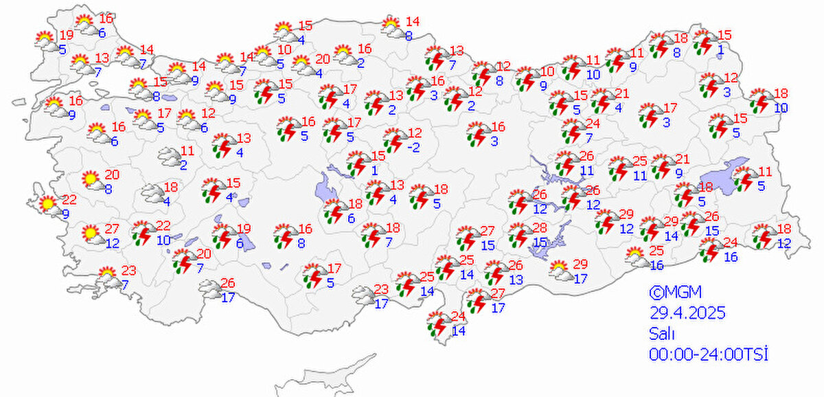 Yapılan son değerlendirmelere göre, ülke genelinin parçalı ve çok bulutlu, Ege, Akdeniz, İç Anadolu, Karadeniz, Doğu ve Güneydoğu Anadolu ile Edirne, Tekirdağ, Kırklareli, Sakarya çevreleri ve Bilecik'in doğu kesimlerinin sağanak ve gök gürültülü sağanak yağışlı geçeceği tahmin ediliyor.