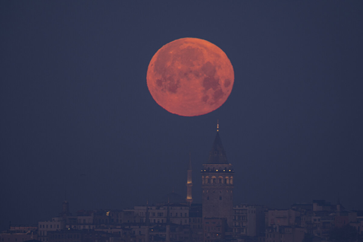 İstanbul'da baharın habercisi olarak bilinen ve 'Pembe Ay' adıyla anılan Dolunay, gökyüzünde görsel şölen oluşturdu.