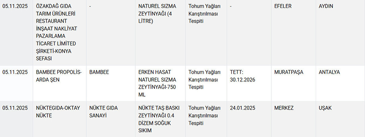 Denetim sonuçlarına göre bazı firmalar, zeytinyağı olarak sattıkları ürünlere tohum yağı karıştırarak tüketiciyi yanıltmış. Bu durum hem ürünün kalitesini düşürürken hem de vatandaşın sağlığını tehlikeye sokuyor. Bakanlık, bu firmaların isimlerini ve marka detaylarını resmî internet sitesinde yayımlayarak ifşa etti.