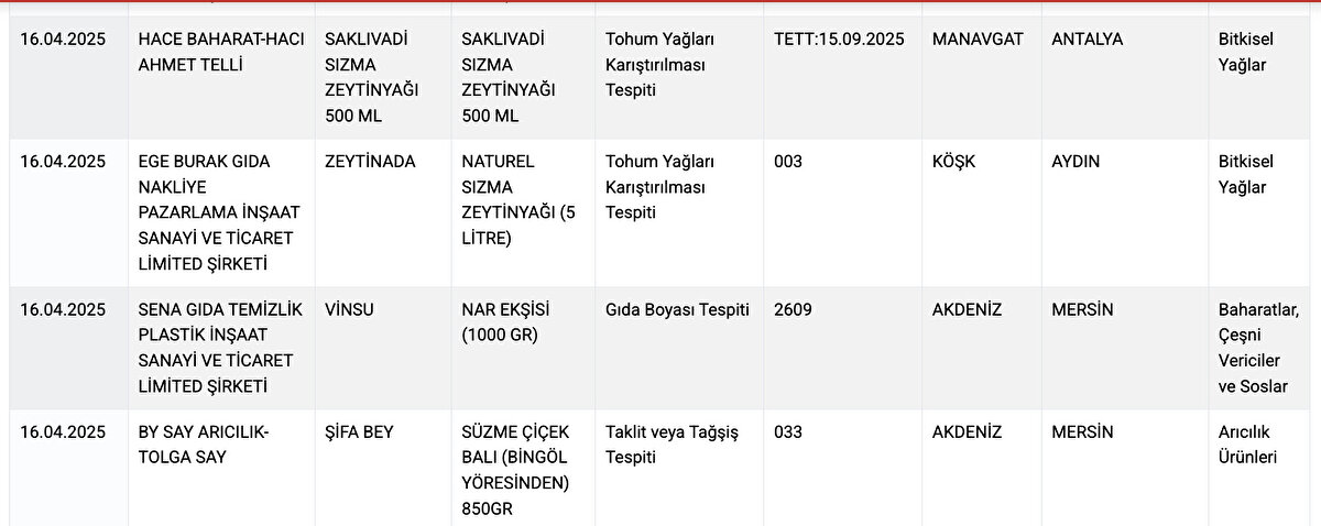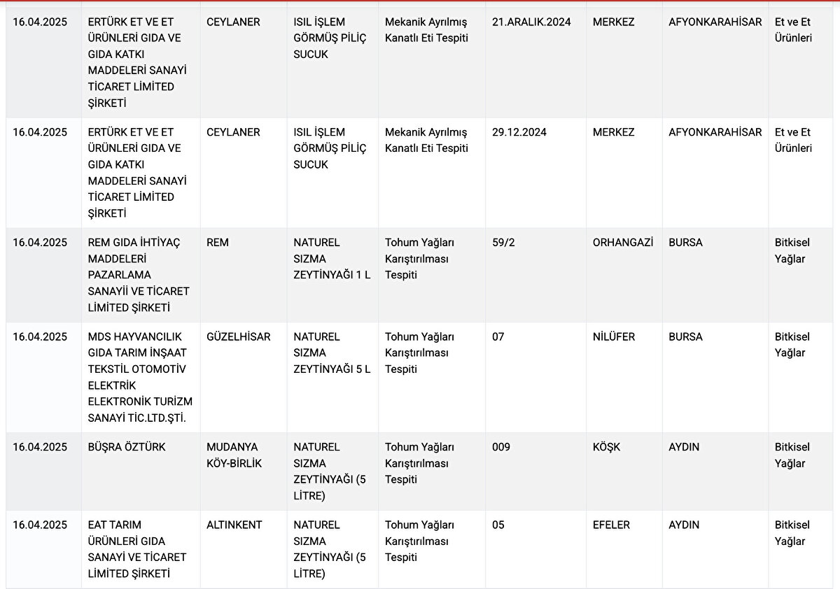 Son yayımlanan listede, et ürünlerinden zeytinyağına, baldan lahmacun ve kebaba kadar pek çok üründe taklit ve tağşiş uygulamaları tespit edildi. Bu ürünlerin tüketici sağlığı açısından ciddi risk taşıdığı belirtildi.
