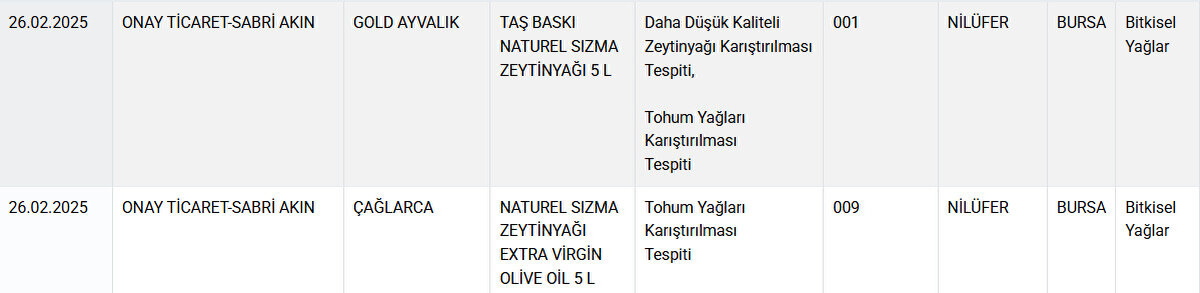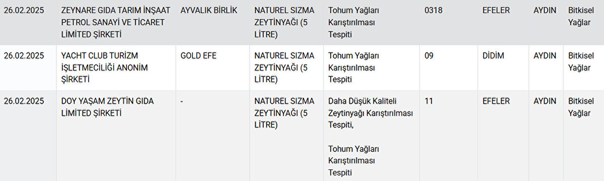 Listede dikkat çeken detay zeytinyağı firmalarının tohum yağı karıştırması, peynir firmalarının yağ oranını düşürmesi oldu.