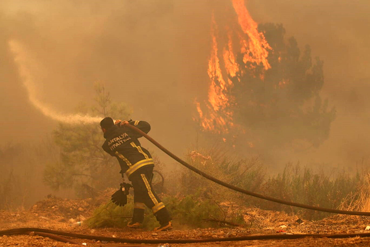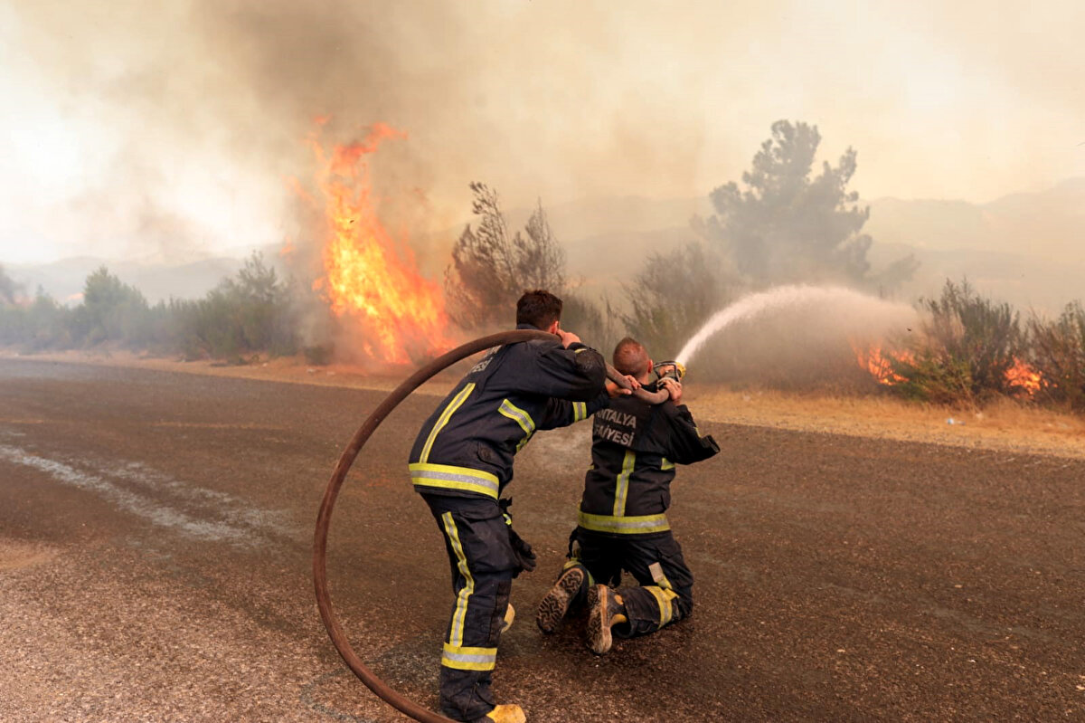 Manavgat'ta 1 haftadır devam eden orman yangınıyla mücadele için 40 ilden itfaiye ekipleri, bölgeye geldi. Yerleşim yerlerine yangının ulaşmaması için hem söndürme hem de soğutma çalışmalarına destek veren itfaiyeciler, zaman zaman tehlikenin ortasında kaldı. Orman ekipleri, 40 dereceyi aşan sıcaklıkta üzerlerinde 400 derece alevlere dayanıklı kumaştan üretilen tulumlar, yanmayan ve elektrik iletmeyen özel çizmeler giyiyor. Ekipler, yeşil alanda alevlerle mücadele ederken destek için gelen itfaiye ekipleri ise yerleşim bölgesinde görev alıyor.