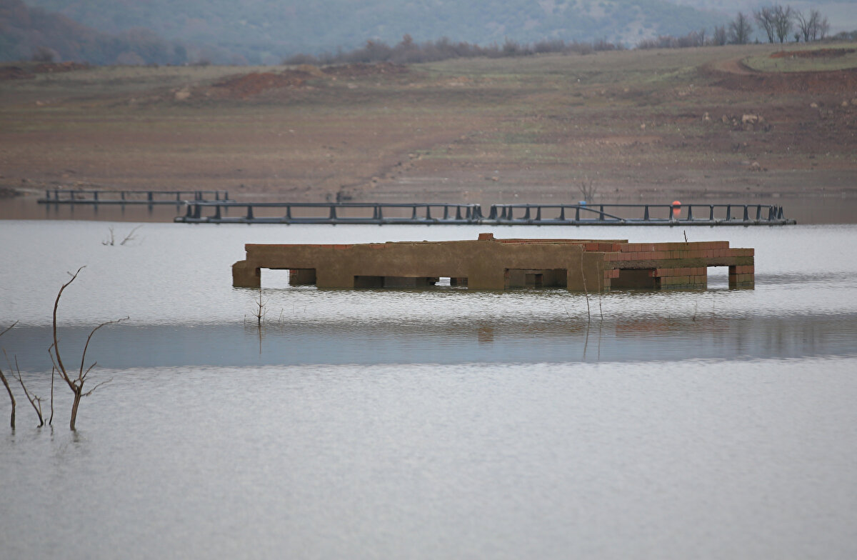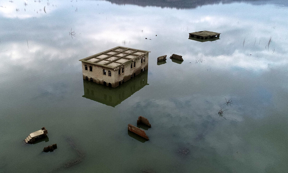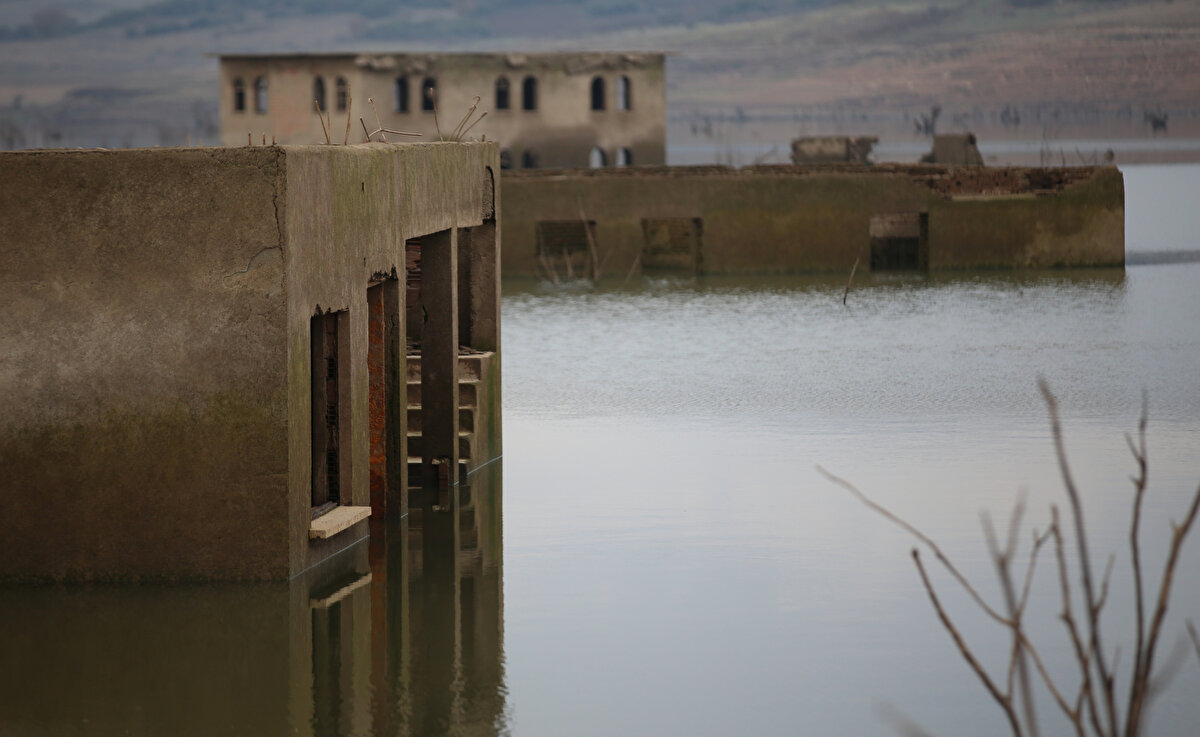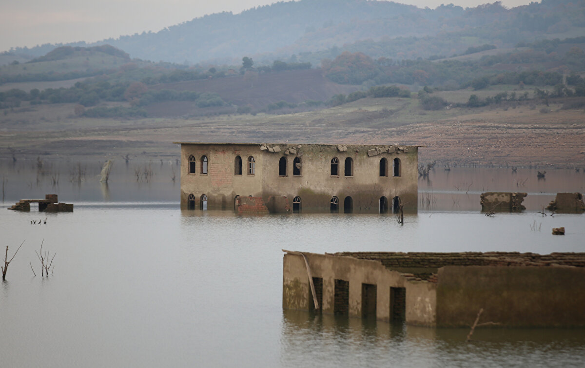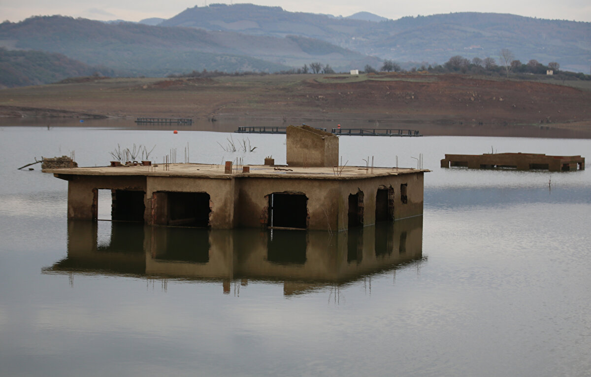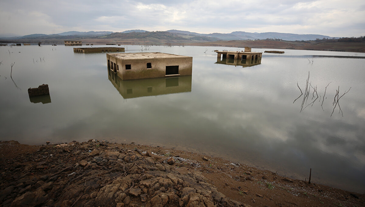Tarımsal sulama amaçlı barajın yapımı için boşaltılarak 1997'de Gökçeada'ya taşınan Eşelek'in eski evleri ve binalardan bazıları yüzeyde görünür hale geldi.