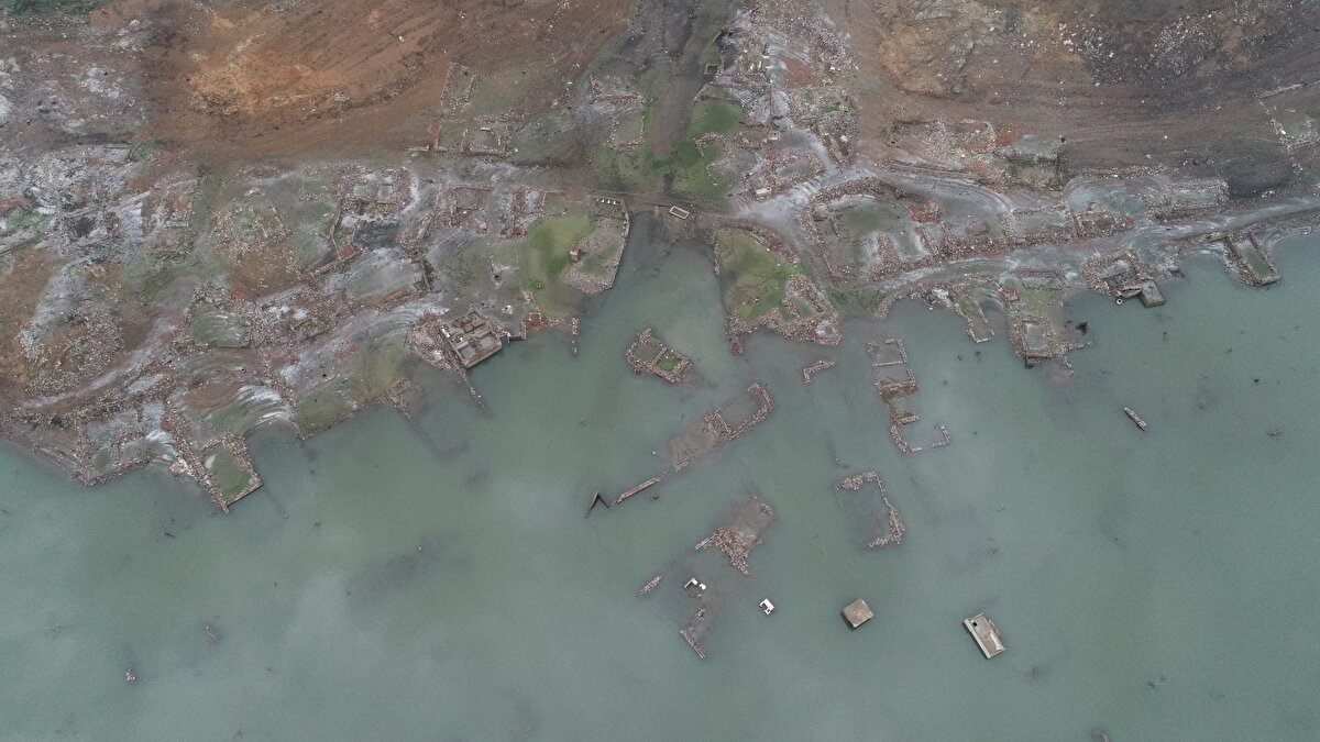 Çanakkale'nin Biga ilçesindeki Bakacak Barajı'nda kuraklık nedeniyle su seviyesinin azalmasının ardından Eşelek köyünün eski yerleşimine ait yapılar yüzeye çıktı.