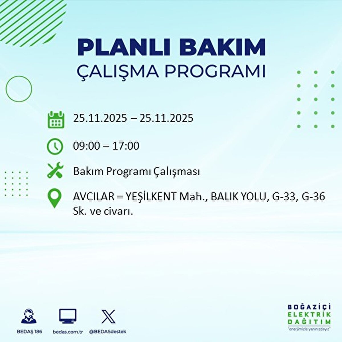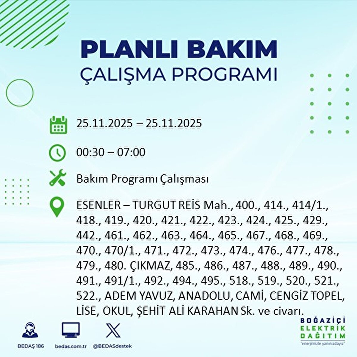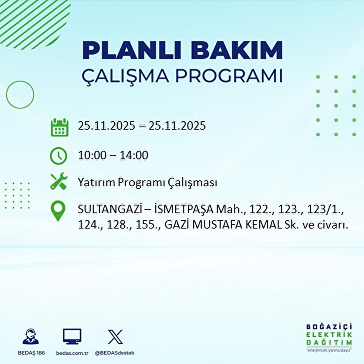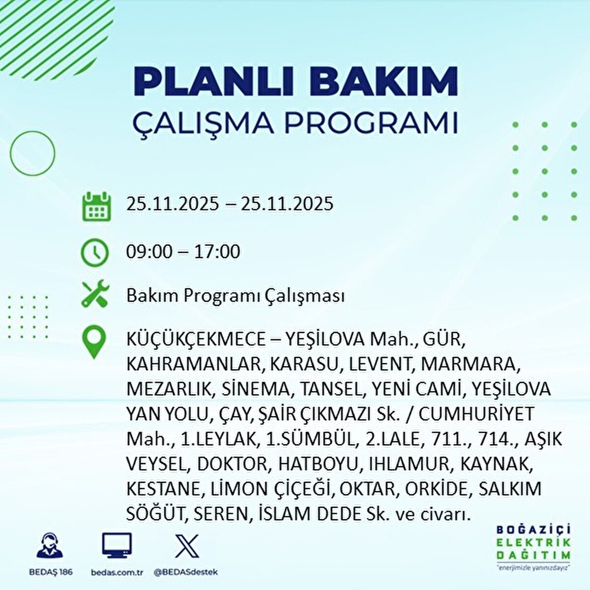 Boğaziçi Elektrik Dağıtım A.Ş. (BEDAŞ), İstanbul’da 25 Kasım Salı günü planlı elektrik kesintisi uygulanacak bölgeleri duyurdu.