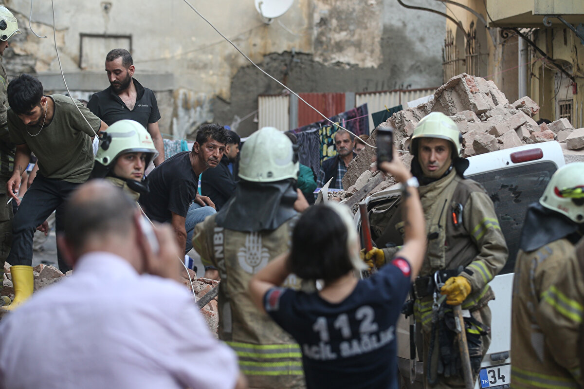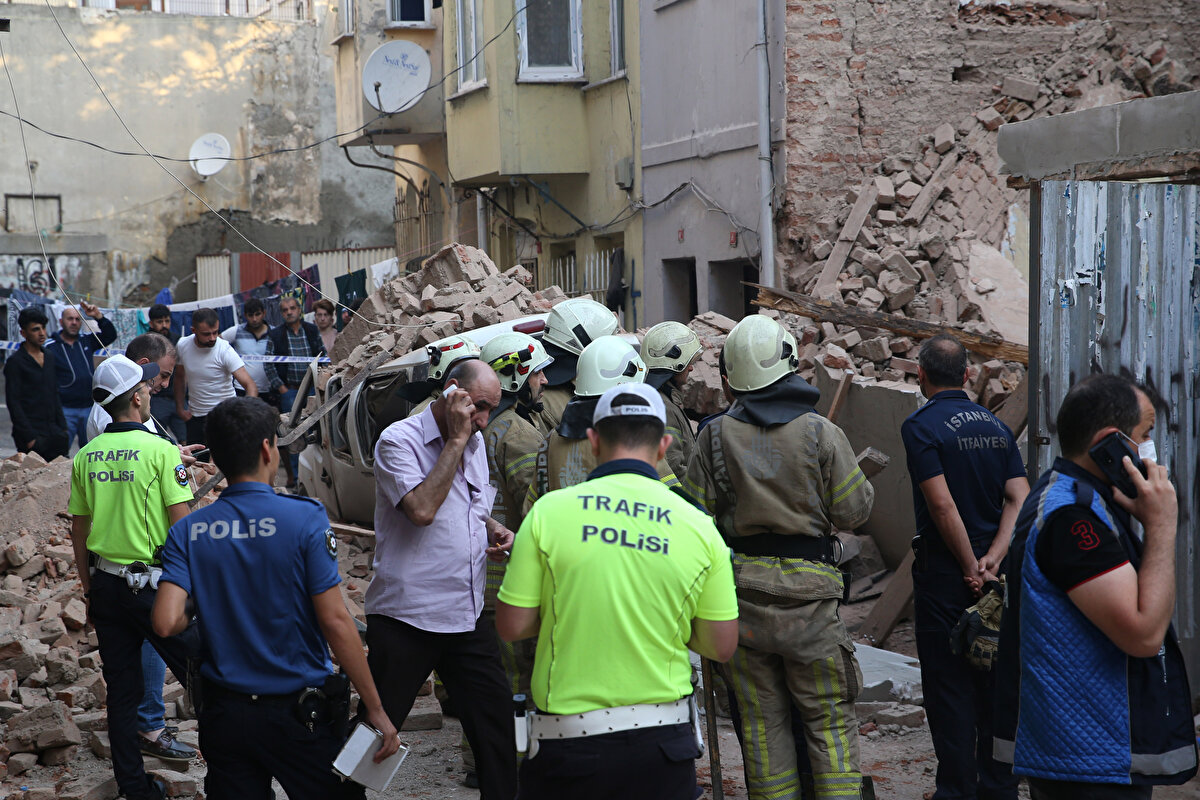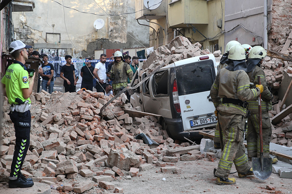 Çökme nedeniyle molozların bir kısmı sokakta park halindeki 34 DOS 783 plakalı hafif ticari aracın üzerine düştü.