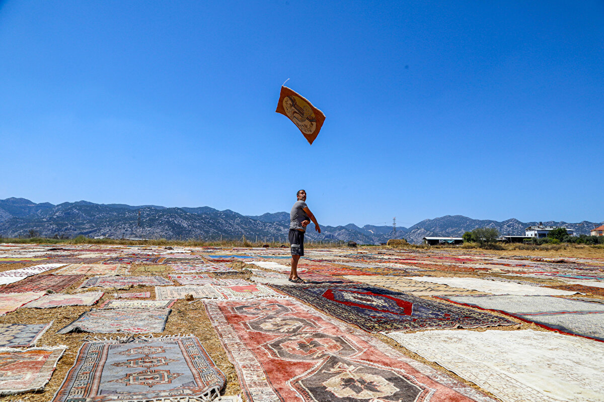 Döşemealtı ilçesinde yıllardır halı alım ve satışının yanı sıra onarımını da yapan Halil Börekçi, bu yıl buğday hasadının ardından 25 dönümlük tarlasına 2 bine yakın halı serdi.
