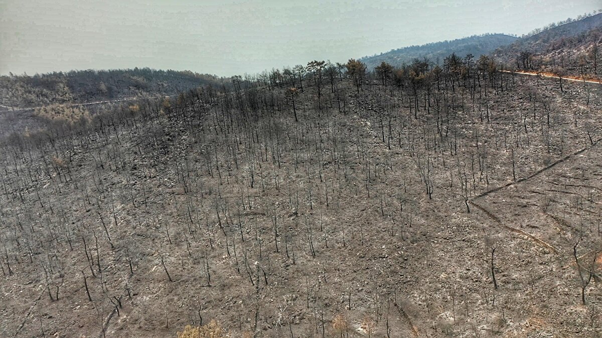 Muğla'nın Bodrum ve Milas ilçelerindeki yangınlarda zarar gören ormanlık alanlar drone ile havadan görüntülendi.