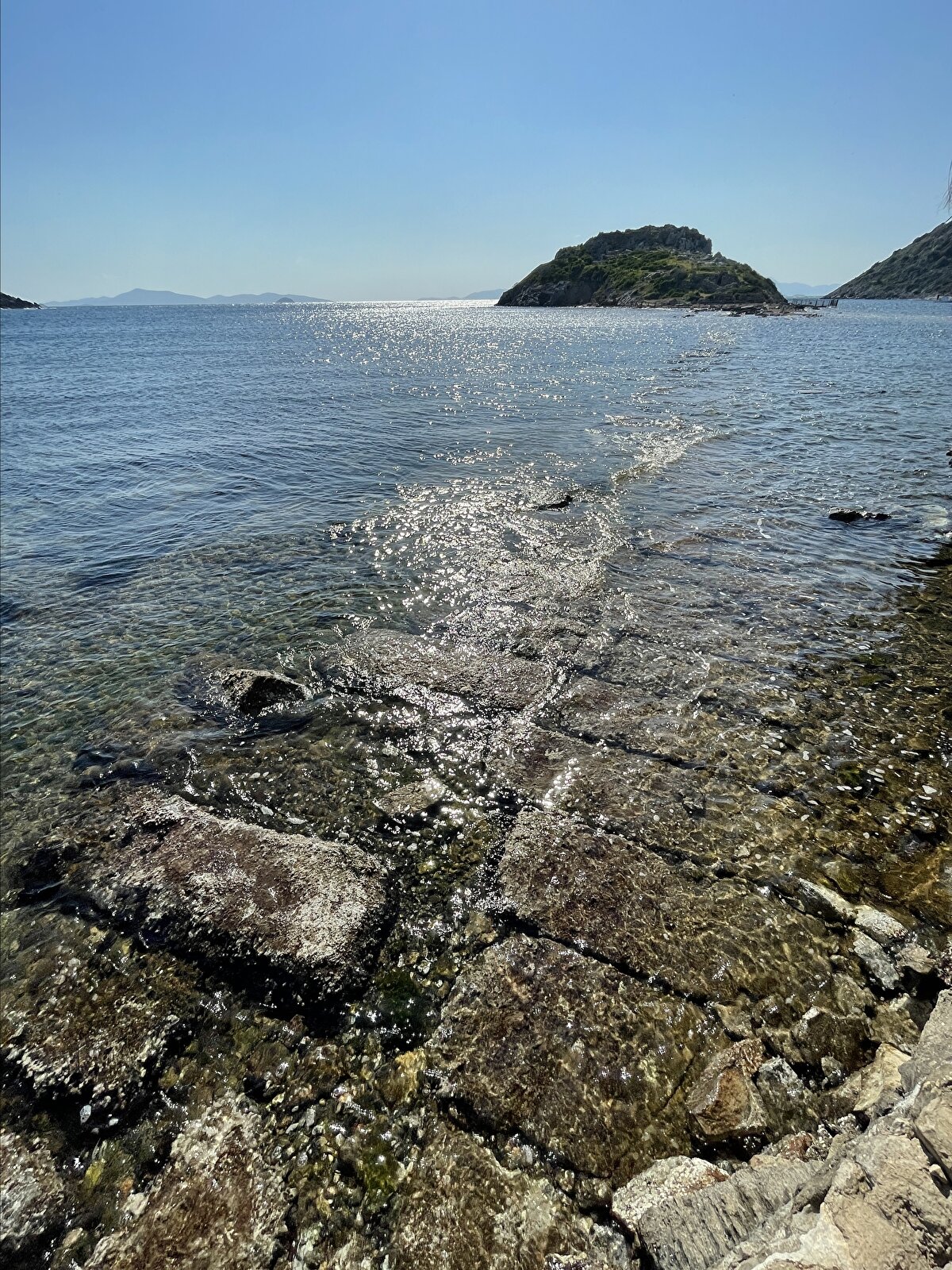 Muğla'nın Bodrum ilçesinde, denizin çekilmesiyle ortaya çıkan Tavşan Adası'na uzanan tarihi sur kalıntıları ilgi topladı.