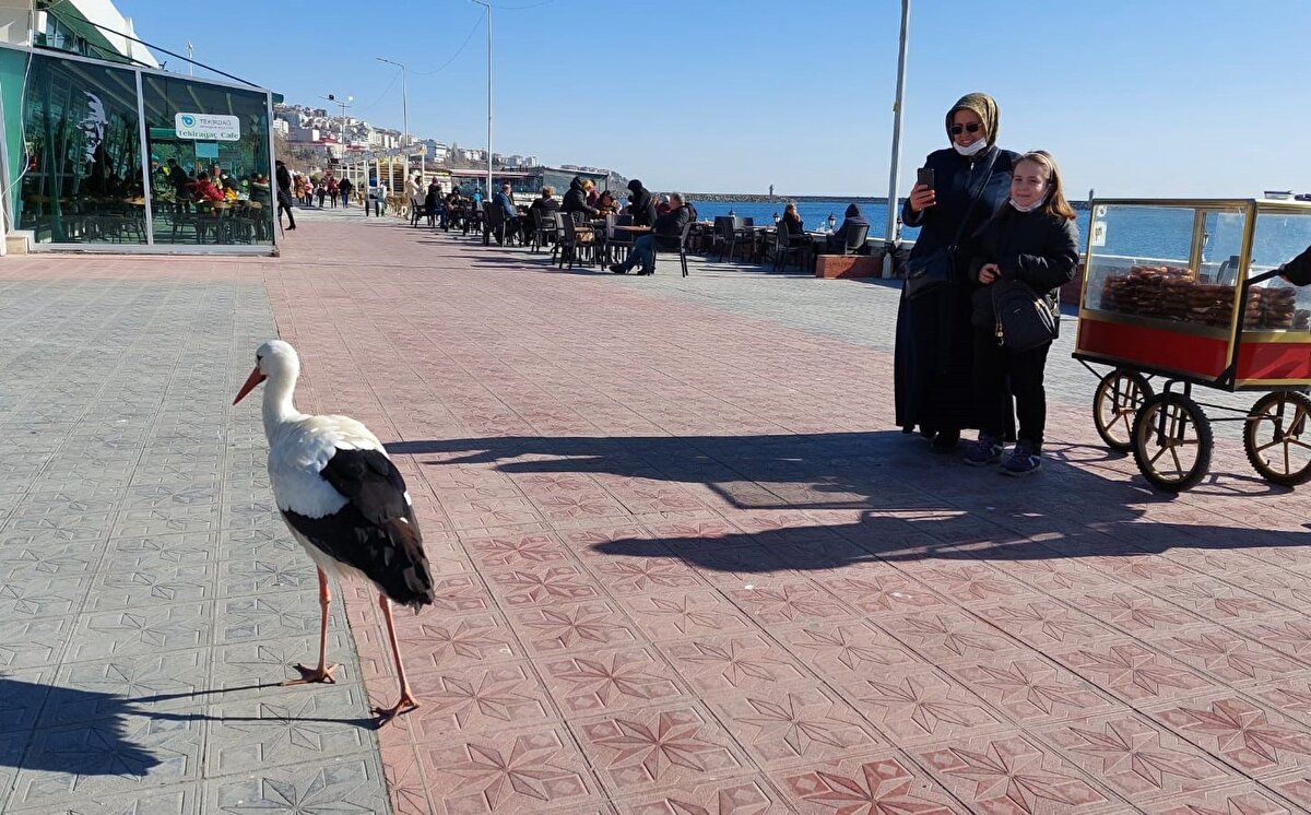 Zaman zaman sahil gezintisine çıkan leylek, vatandaşlarında yoğun ilgisiyle karşılaşıyor. Artık her yere yürüyerek giden ve şehrin maskotu haline gelen leylek, vatandaşlarla fotoğraf çekiliyor ve rahat rahat insanların ellerinden yem yiyebiliyor.