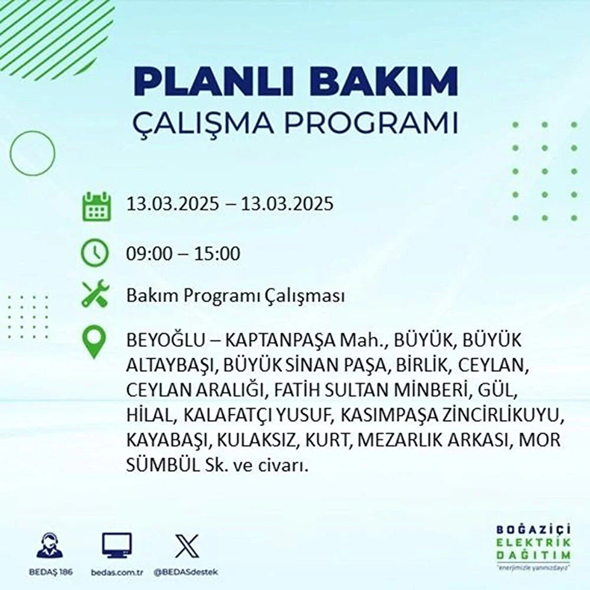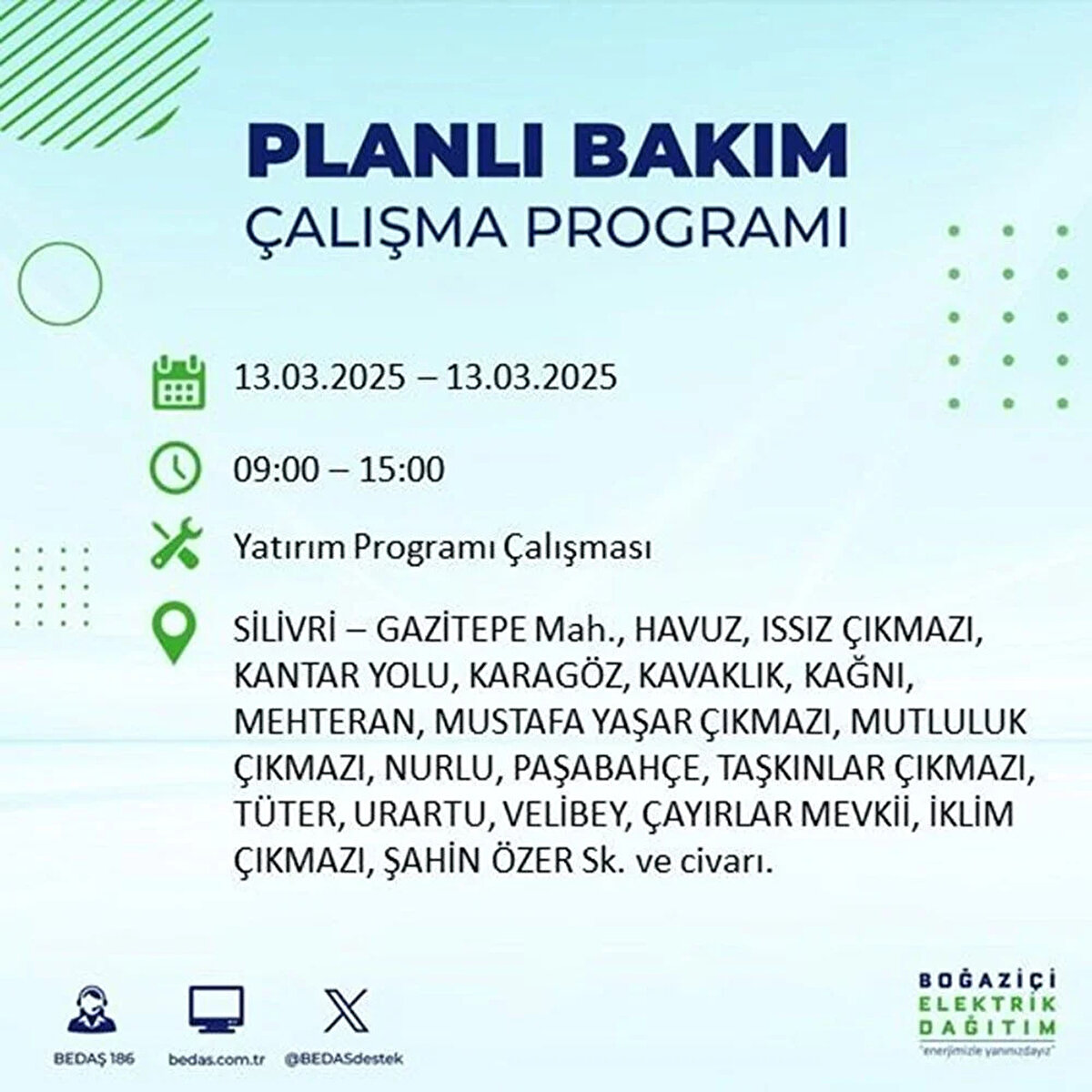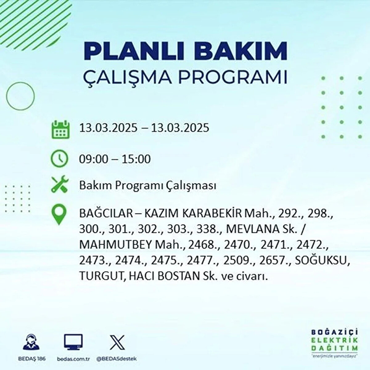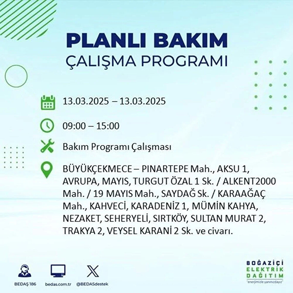 Boğaziçi Elektrik Dağıtım A.Ş. (BEDAŞ) tarafından sosyal medyada yapılan duyuruya göre, İstanbul'da bugün (13 Mart) planlı bir kesinti yaşanacak.
