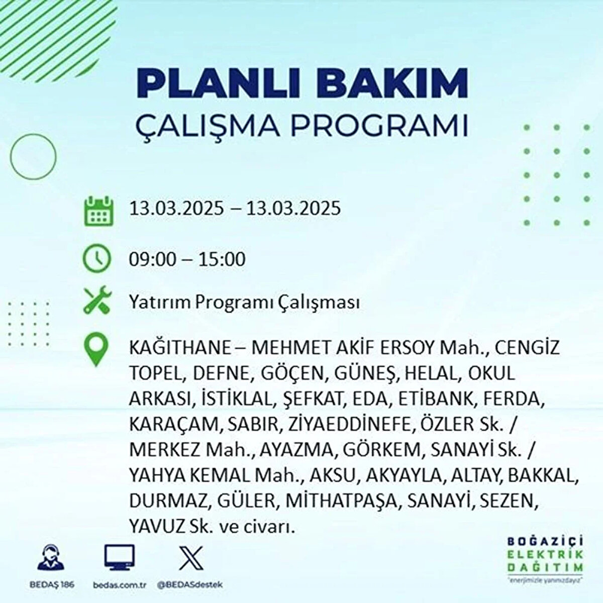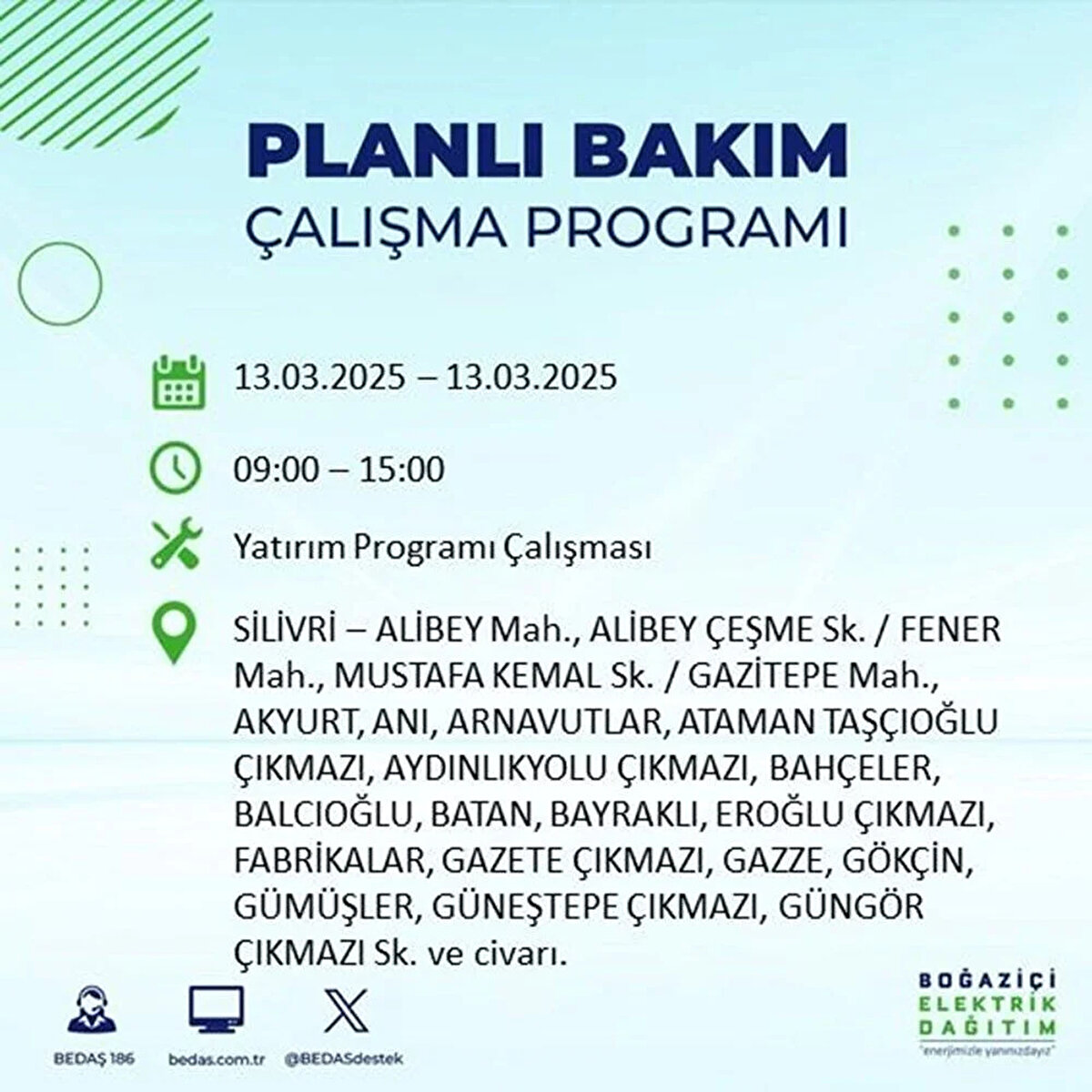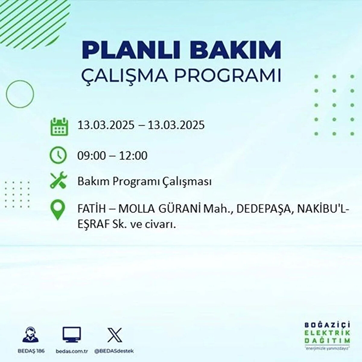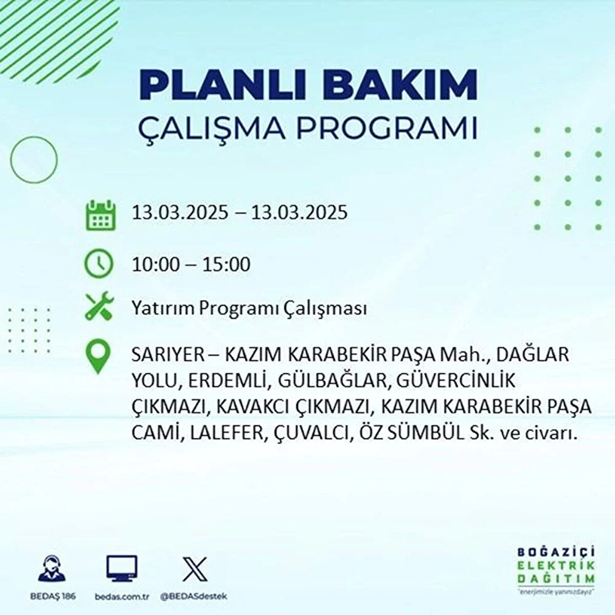 Boğaziçi Elektrik Dağıtım A.Ş. (BEDAŞ) tarafından sosyal medyada yapılan duyuruya göre, İstanbul'da bugün (13 Mart) planlı bir kesinti yaşanacak.