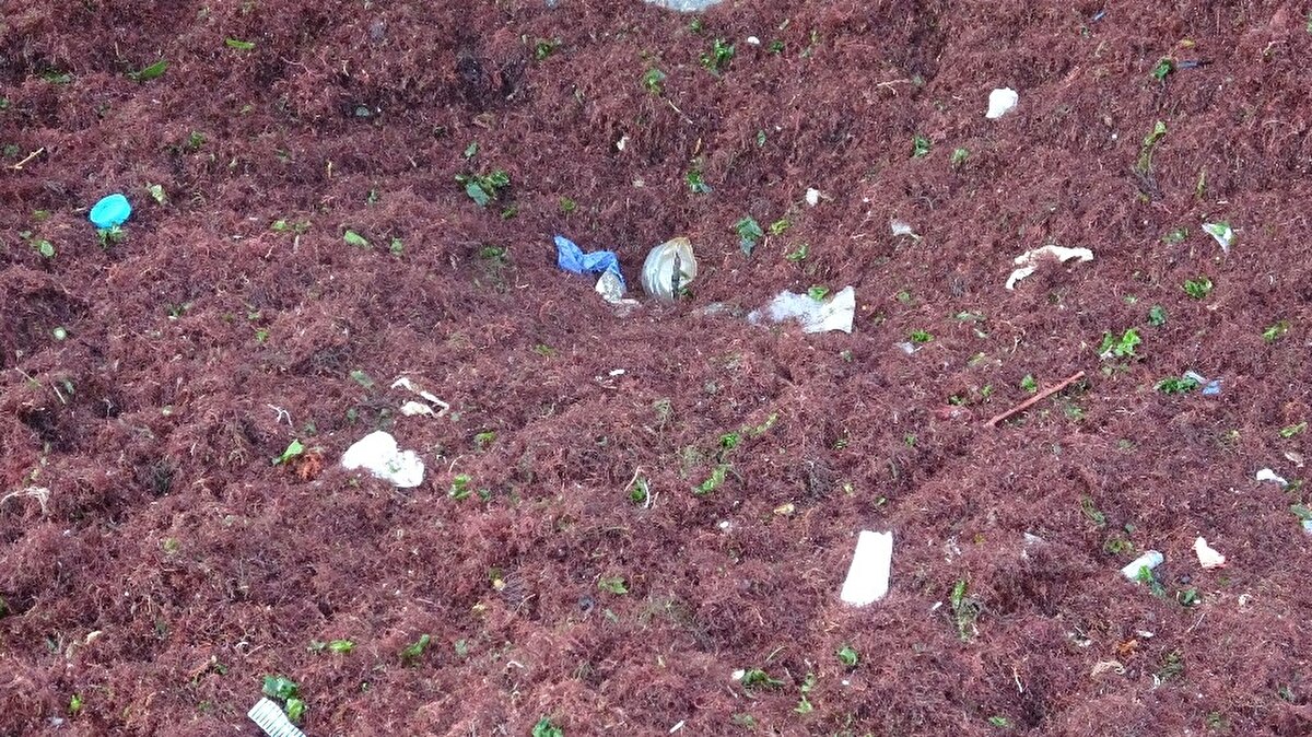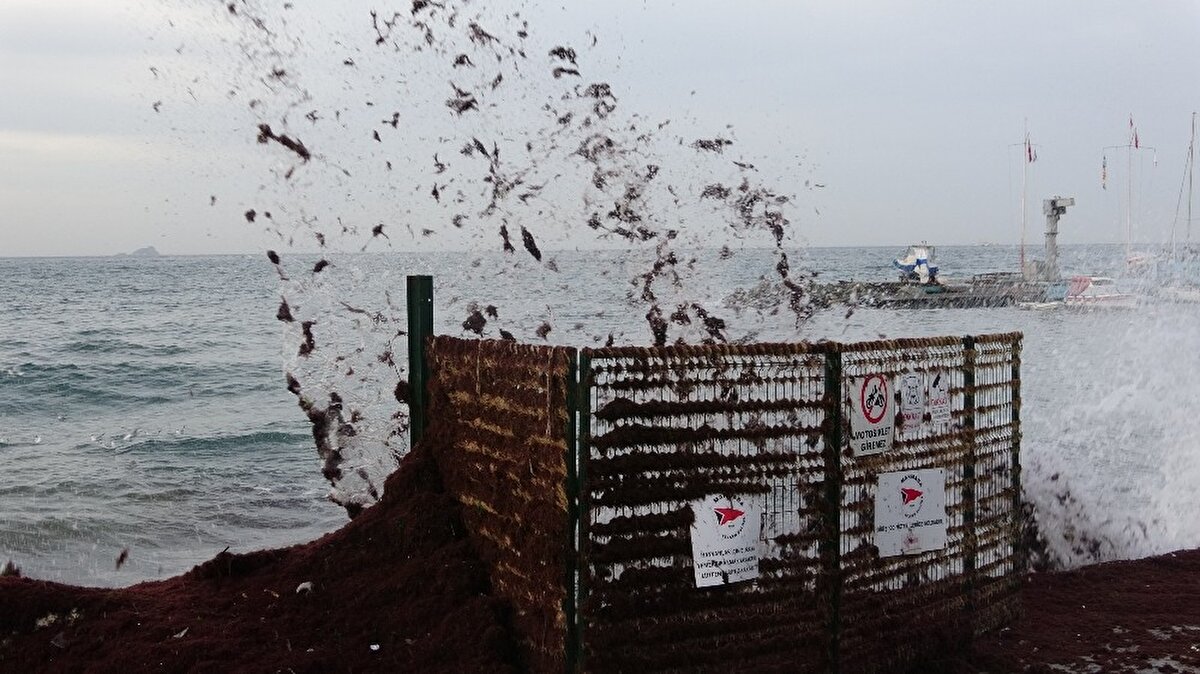 Denizde etkili olan ve kayalıkları döven dalgalar nedeniyle kırmızı yosunlar ile çöpler denizden sahile vurdu.
