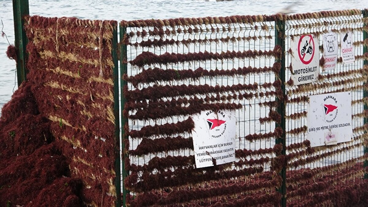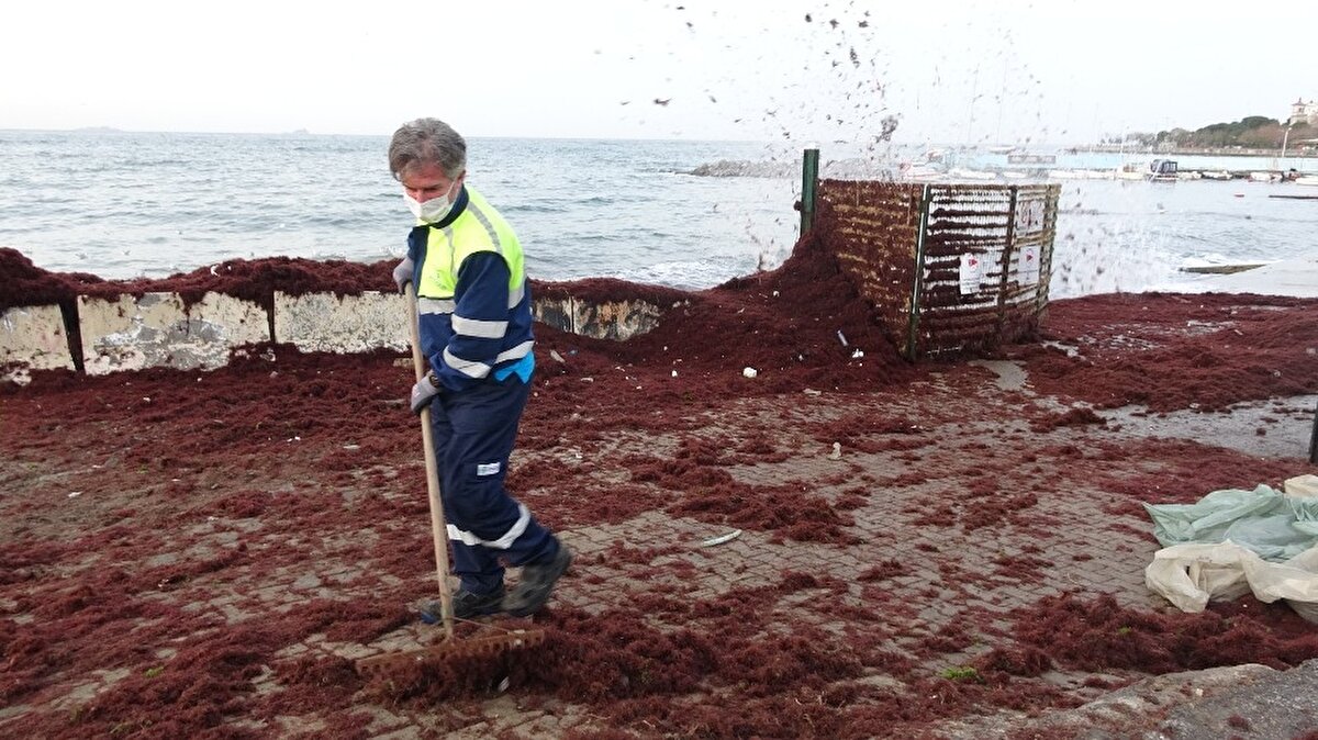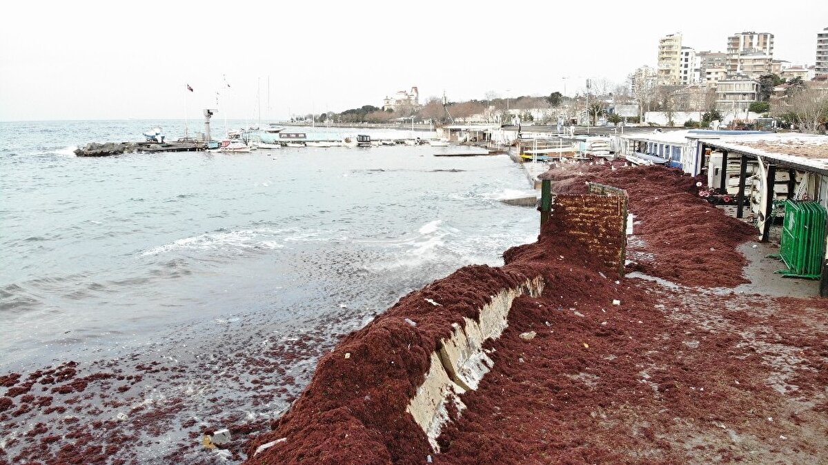 İstanbul Kadıköy'de Caddebostan Sahilinde kayalıkları kırmızı yosunlar ve çöpler kapladı. Denizde etkili olan dalgalar, kırmızı yosunları sahildeki kayalıklara çıkararak kırmızı görüntüler oluşturdu.