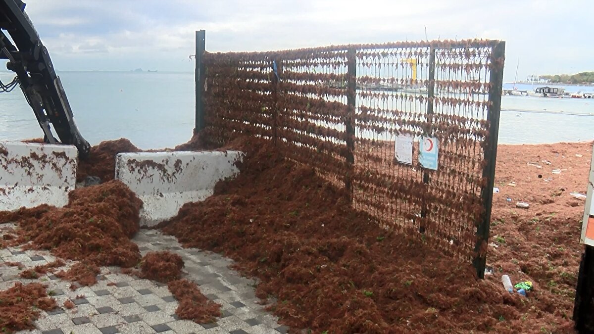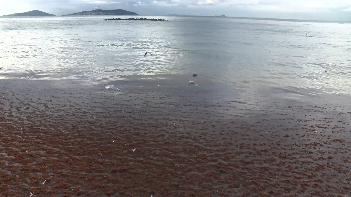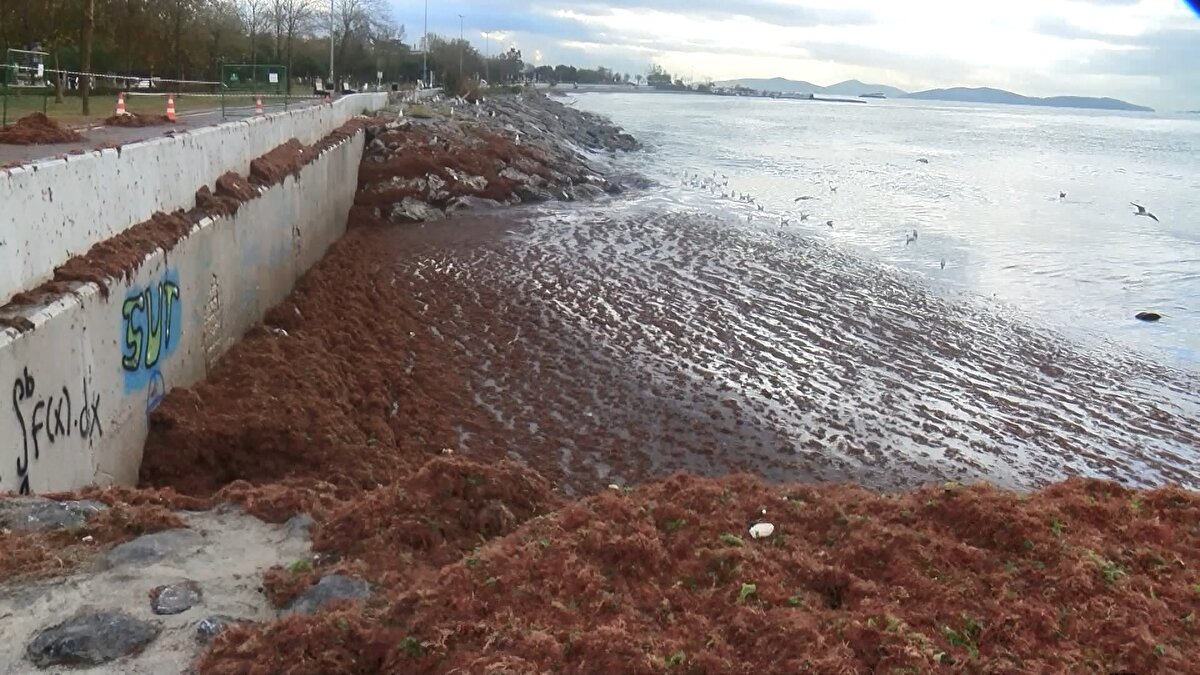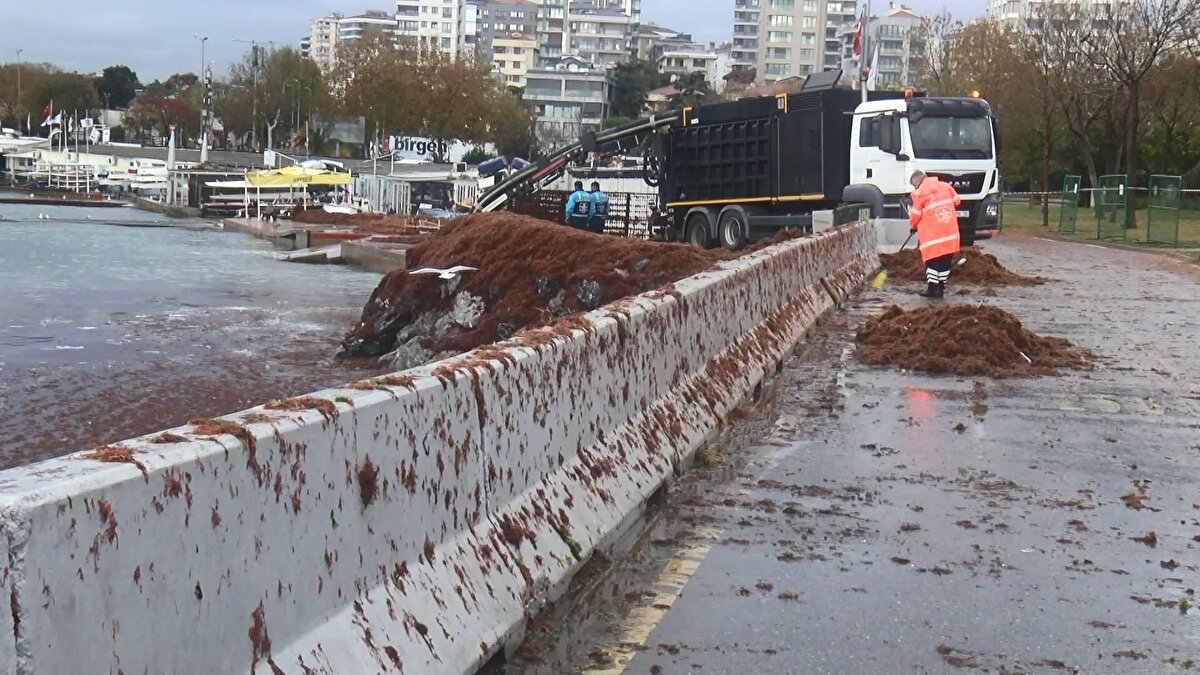 İstanbul'da etkili olan lodos sonrası Caddebostan Sahili kırmızı yosunla kaplandı. Dev dalgalarla kıyıya vuran kırmızı yosunları temizlemek için çalışma başlatıldı.