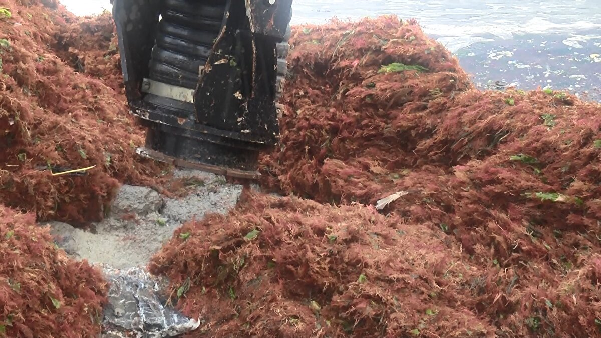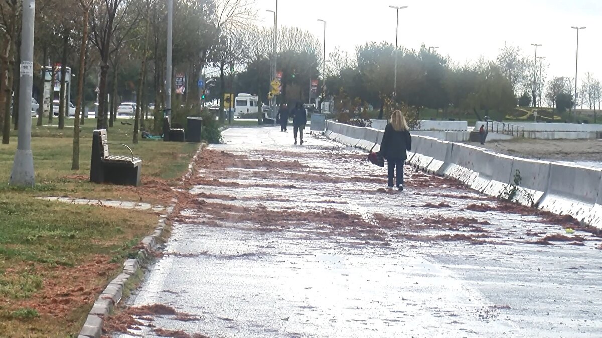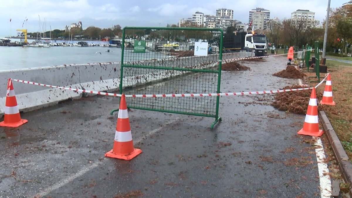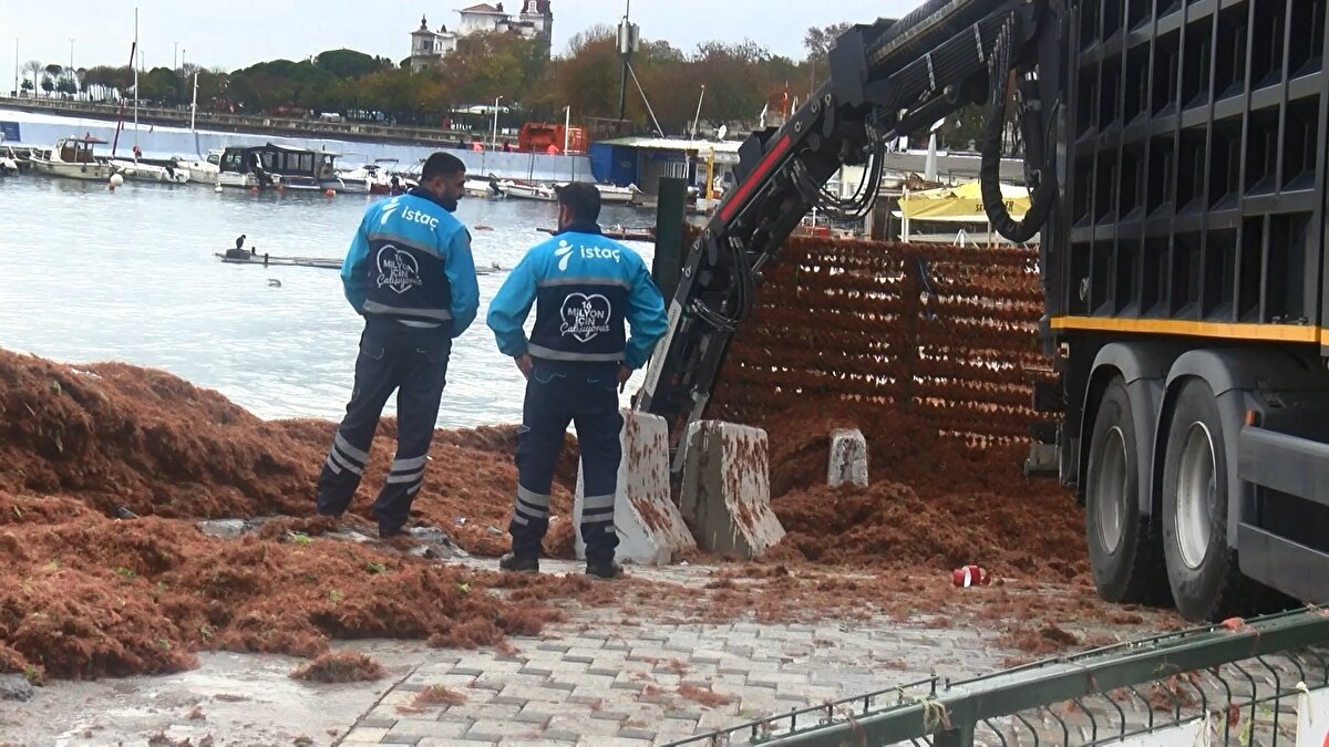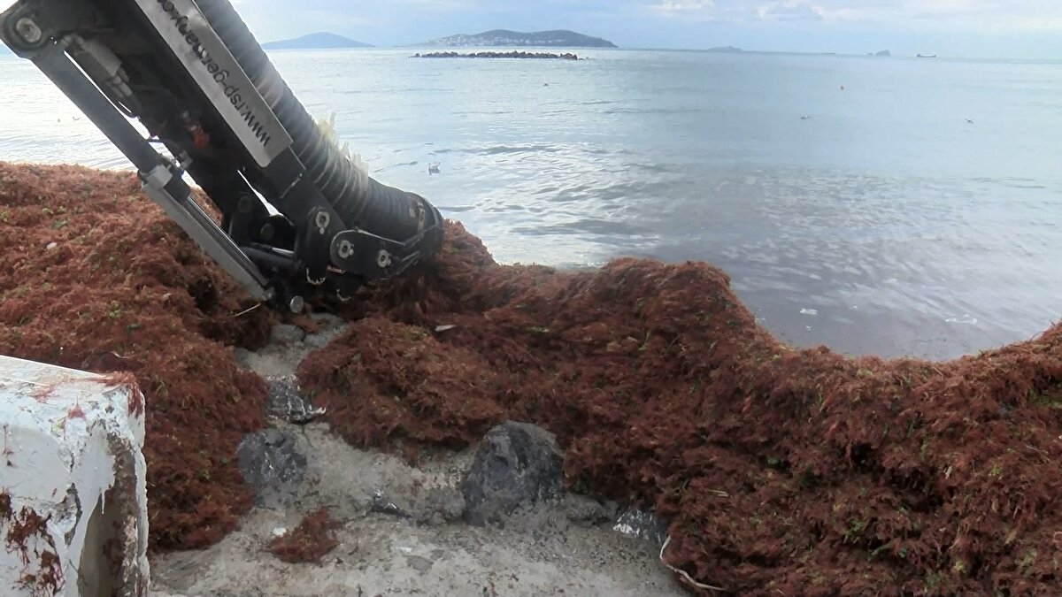 İstanbul'da etkili olan lodos sonrası Caddebostan Sahili kırmızı yosunla kaplandı. Dev dalgalarla kıyıya vuran kırmızı yosunları temizlemek için çalışma başlatıldı.