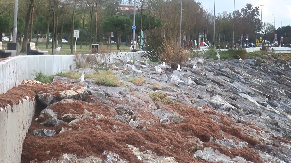 İstanbul’da iki gündür Lodos etkili oluyor. Dev dalgaların sürüklediği kırmızı renkteki yosunlar Caddebostan Sahili'ni ve kayalıkları kapladı.