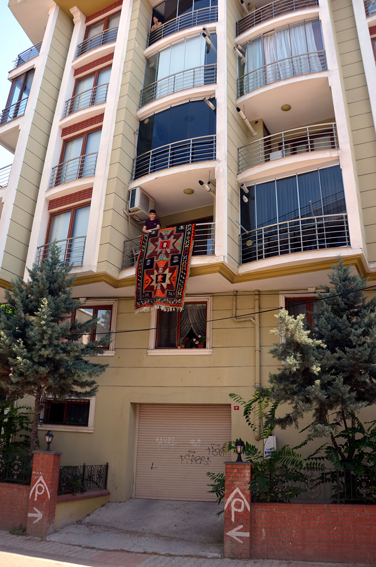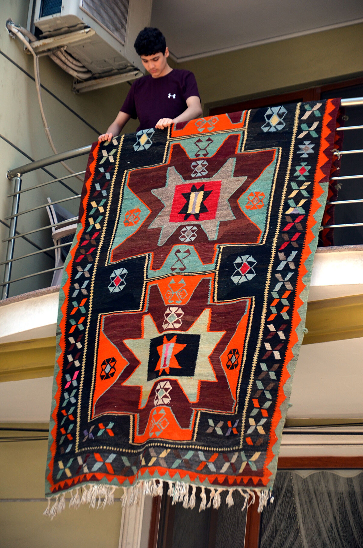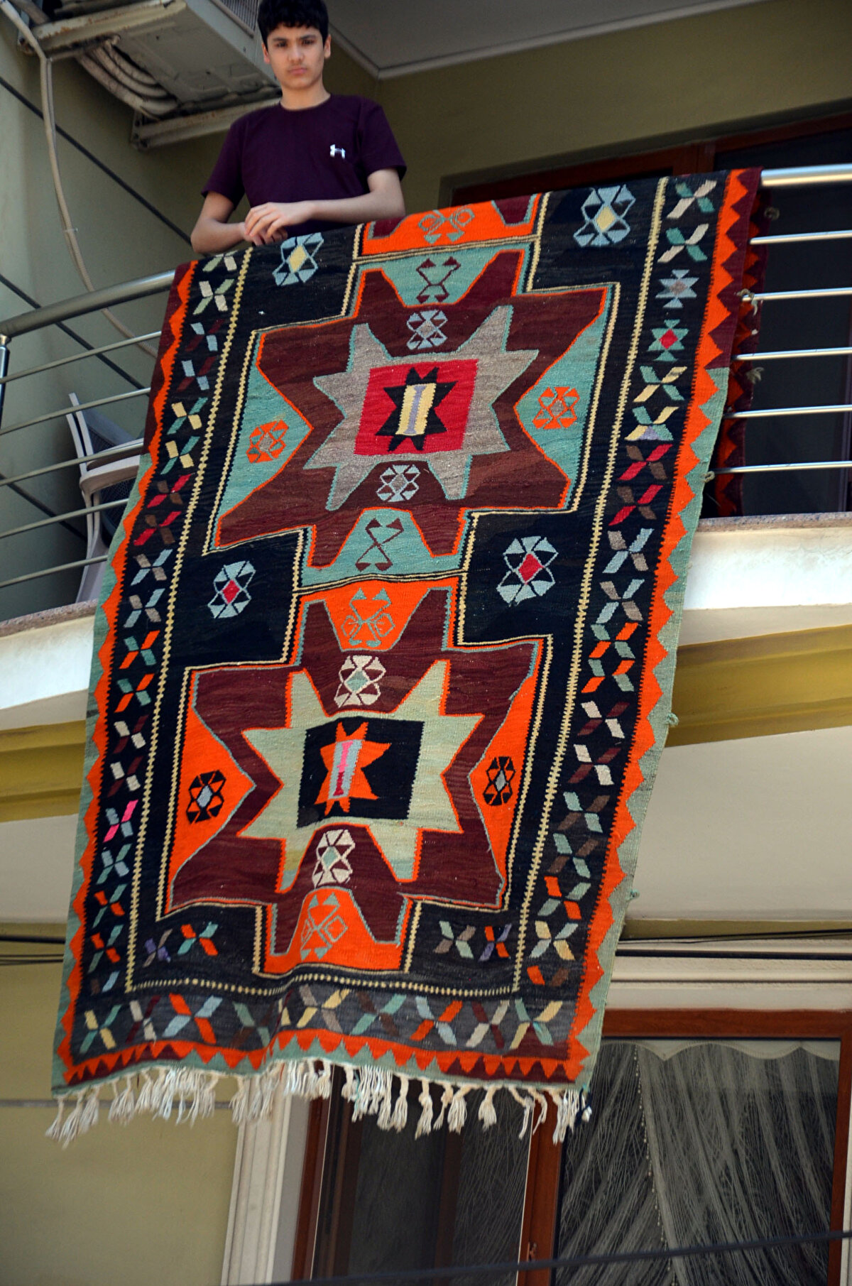 Cennet Mahallesi'nde oturan Ercan Dede, 3 gün önce birinci kattaki balkon demirine kök boyadan yapılan 100 yıllık olduğu belirtilen halıyı astı.