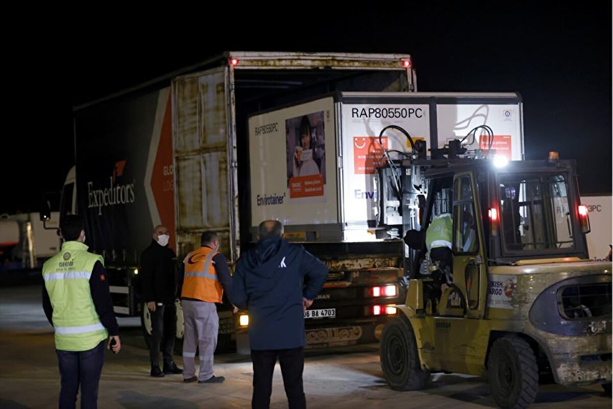 Toplam 17 konteyner içerisinde yer alan 3 milyon doz aşı, Ankara Esenboğa Havalimanı’na geldikten sonra burada 7 adet tıra yüklendi. 2 ila 8 derece arasında saklanabilen aşılar, bu sıcaklık için özel tasarlanan soğutuculu konteynerler içerisinde getirildi.
