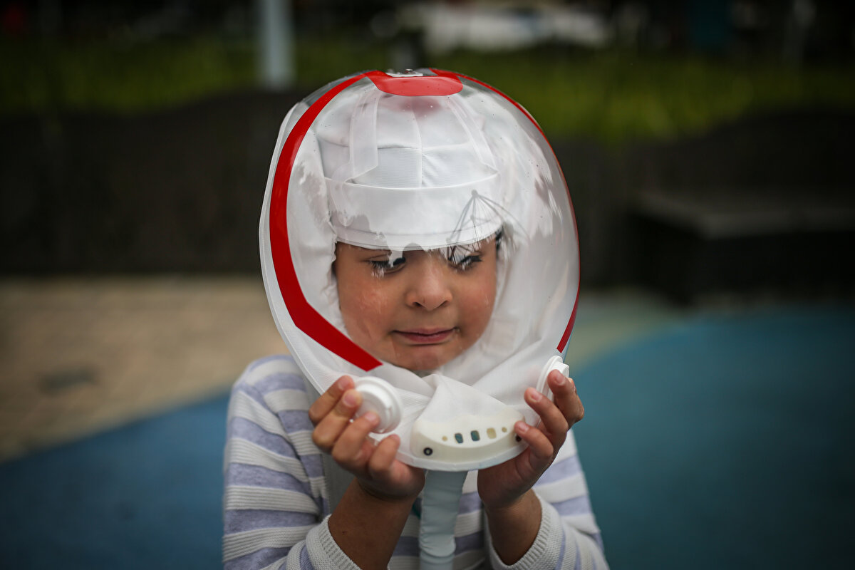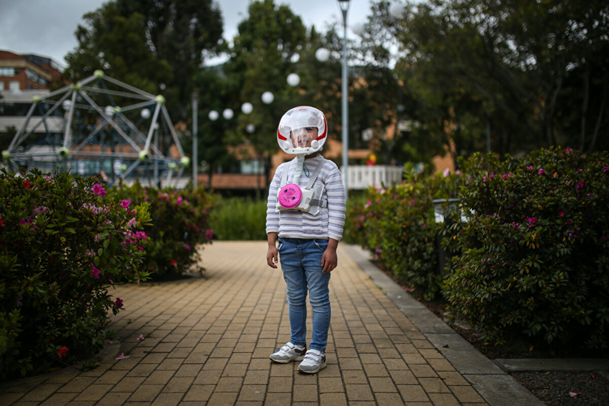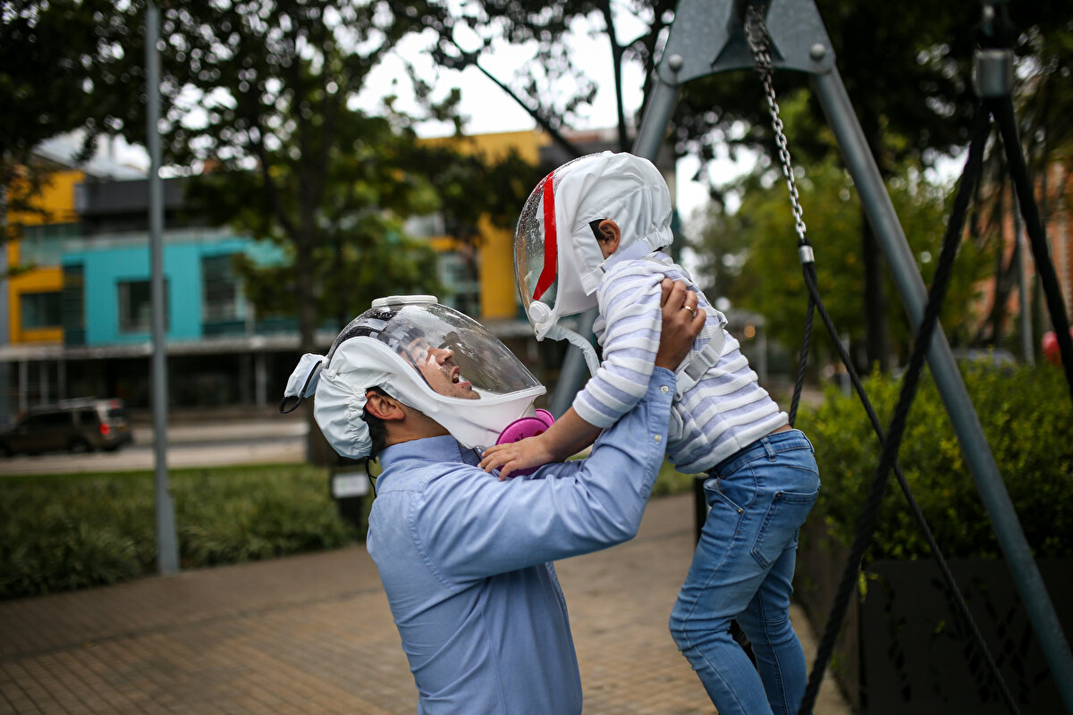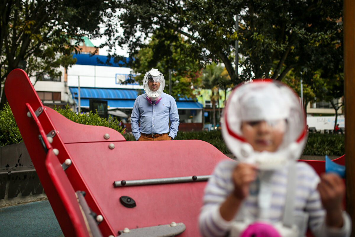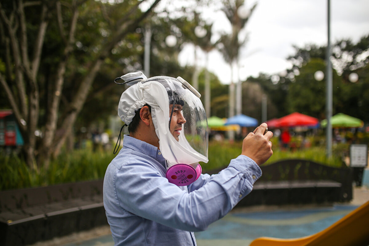 Kolombiya'nın başkenti Bogota'da, mühendis girişimciler koronavirüs (COVID-19) ile mücadele kapsamında, yüzü bir balon şeklinde kaplayarak nefes almayı kolaylaştıracak yeni bir kask üretti.