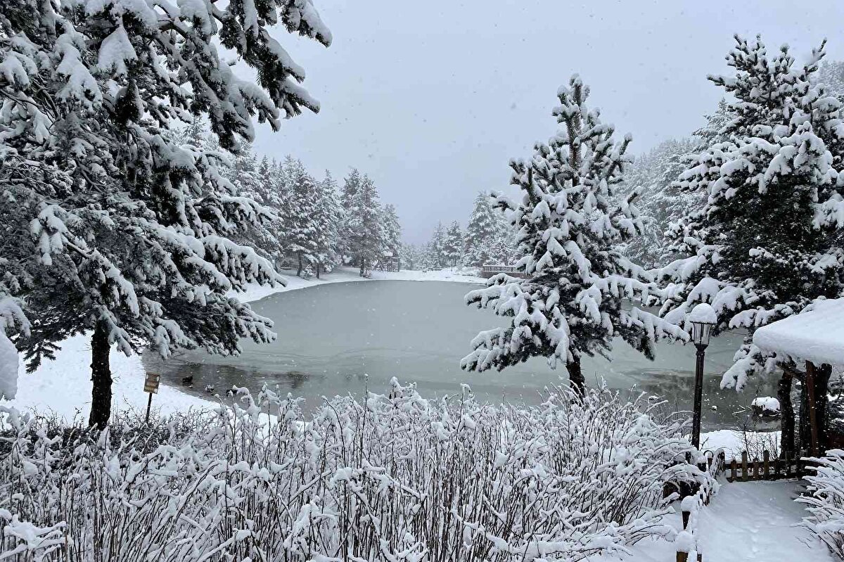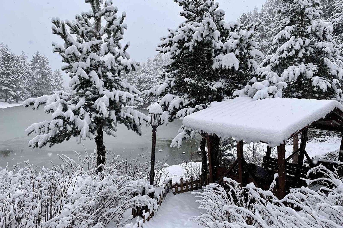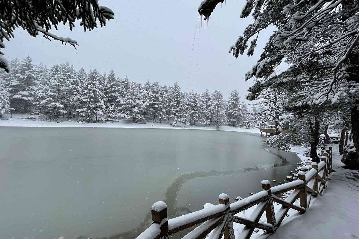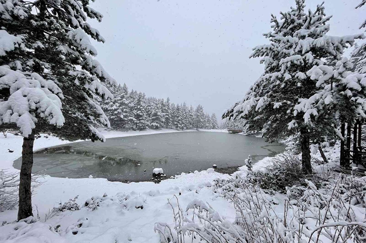 Çam ağaçlarının üzeri yer yer kalınlığı 20 santimetreyi bulan ve pamuğu andıran kar kütleleriyle kaplanırken, hava sıcaklığının özellikle geceleri sıfırın altına düşmesi nedeniyle göl yüzeyinin bir kısmı buzla kaplandı.
