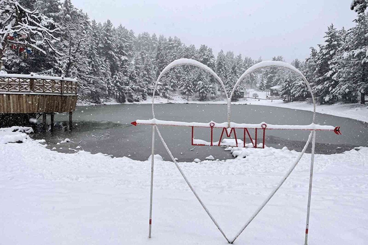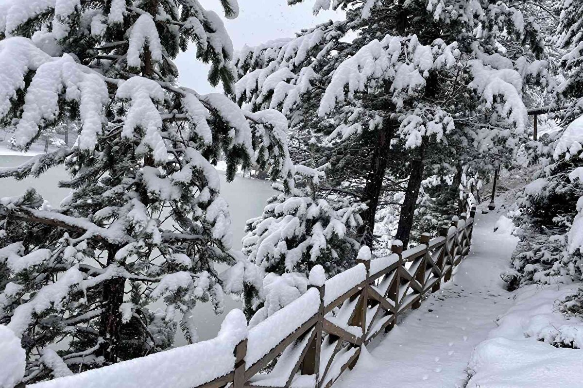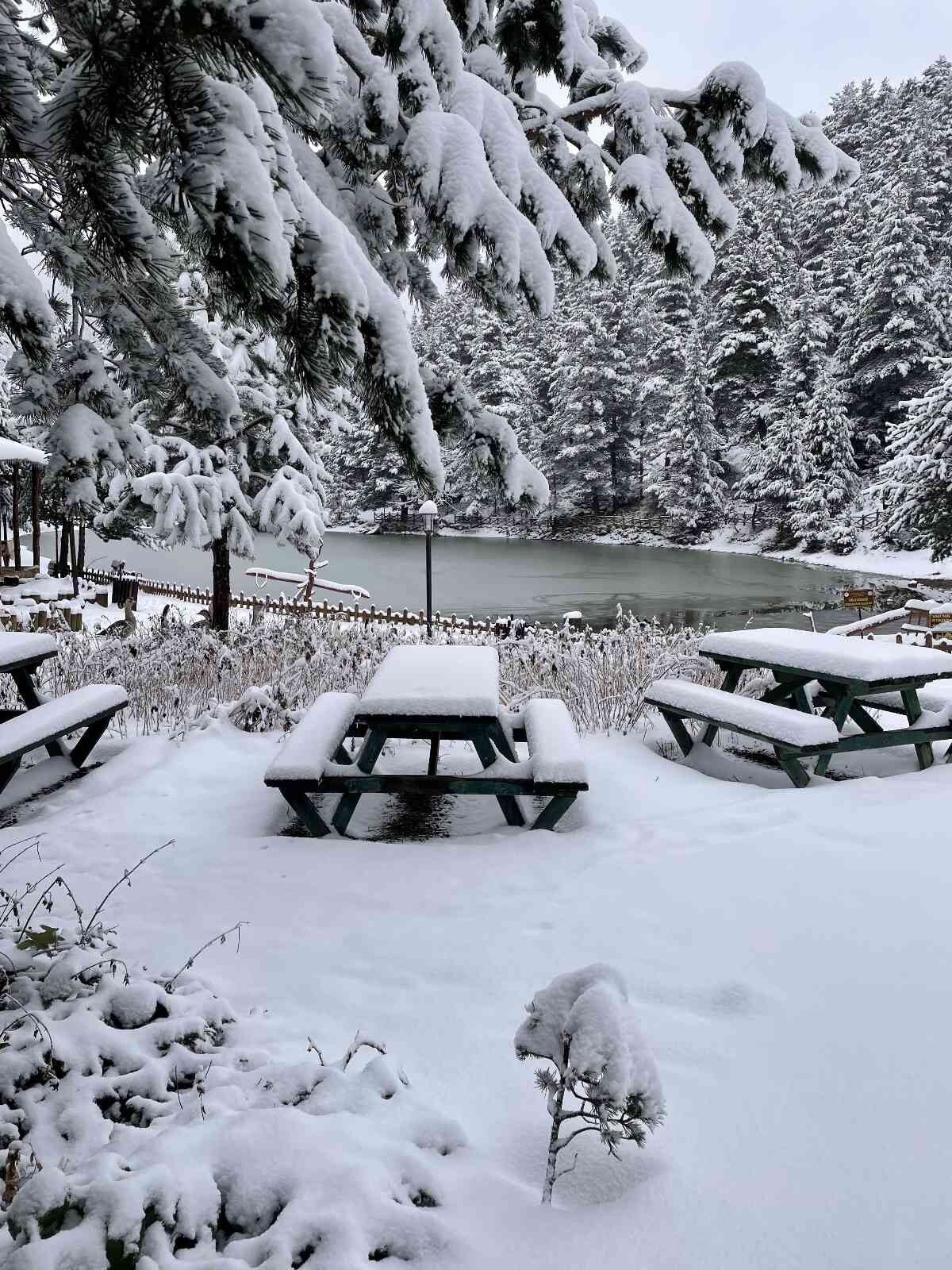 Çam ağaçlarının üzeri yer yer kalınlığı 20 santimetreyi bulan ve pamuğu andıran kar kütleleriyle kaplanırken, hava sıcaklığının özellikle geceleri sıfırın altına düşmesi nedeniyle göl yüzeyinin bir kısmı buzla kaplandı.