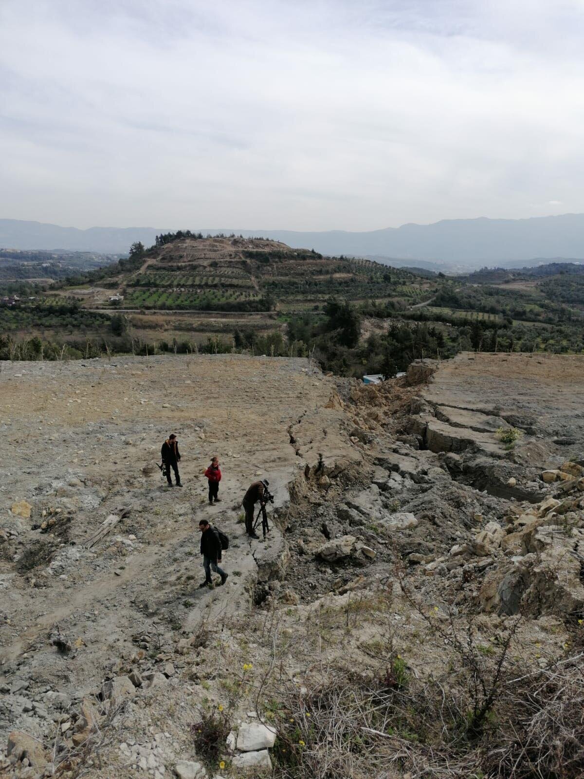 Prof. Dr. Sözbilir, Hatay'ın Samandağı ilçesi Çubuklu köyünde ikiye bölünerek bir parçası 10 metre yer değiştiren zeytin ağacında incelemelerde bulundu.